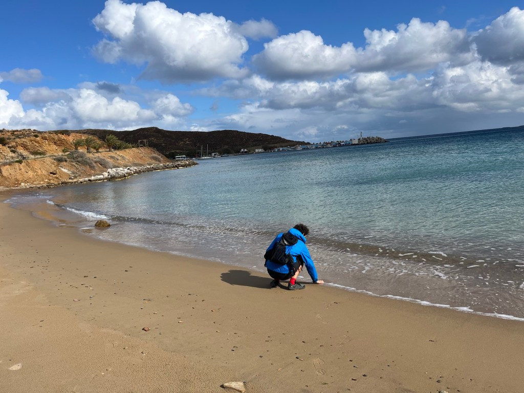 We ate banana pancakes, using a cheaper banana for the batter, and slicing a Cretan banana on top. It was a truly delicious banana. About one o’clock we walked down to the harbour. There was a makeshift cafe with quite a lot of locals inside, some peering at us with curiosity.