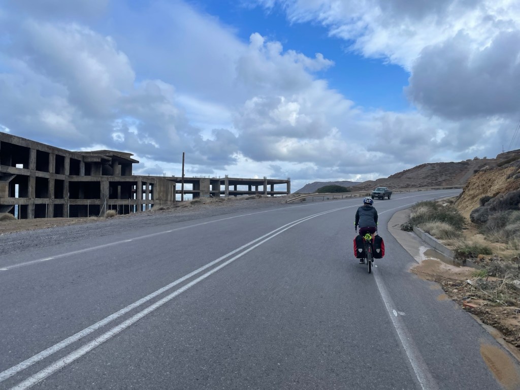 Luckily the wind was favouring us and we raced along the coast. The first hill was a little one and it went up and round a hill on the coast just before the weirdly, perfectly rectangular village of Dionisos. It looked a little off but we didn’t go in. Later investigation shows it’s an abandoned timeshare project from the nineties which has made it a destination for a very different reason.