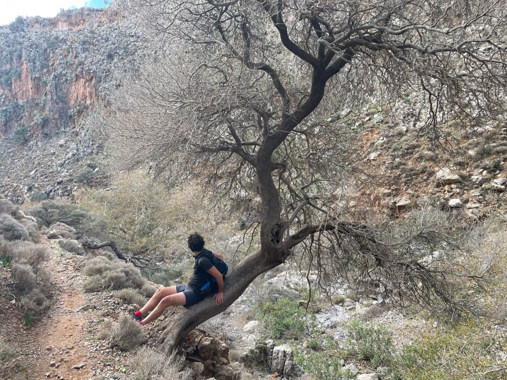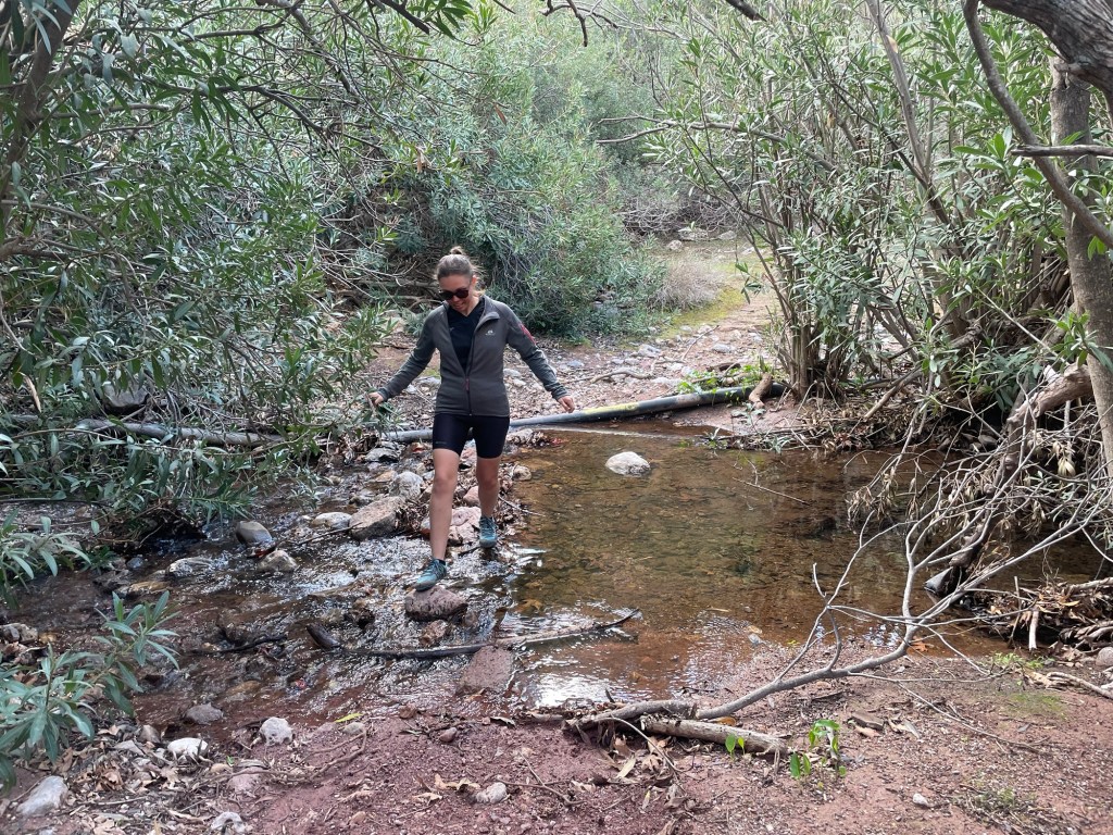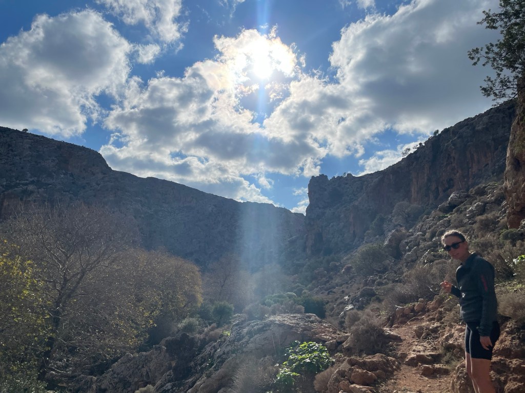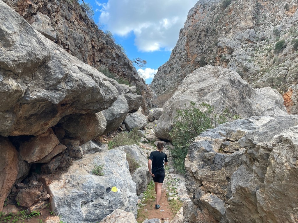 We were dropped at the well signposted ‘Entrance A’ just outside Zakros. We walked on a dusty track and soon found a sign for the E4. It’s a long distance walking route that starts in Spain. It uses the gorge for the last part in Greece before heading to Cyprus. We went down, through a gate and into the valley where there was a flowing river.