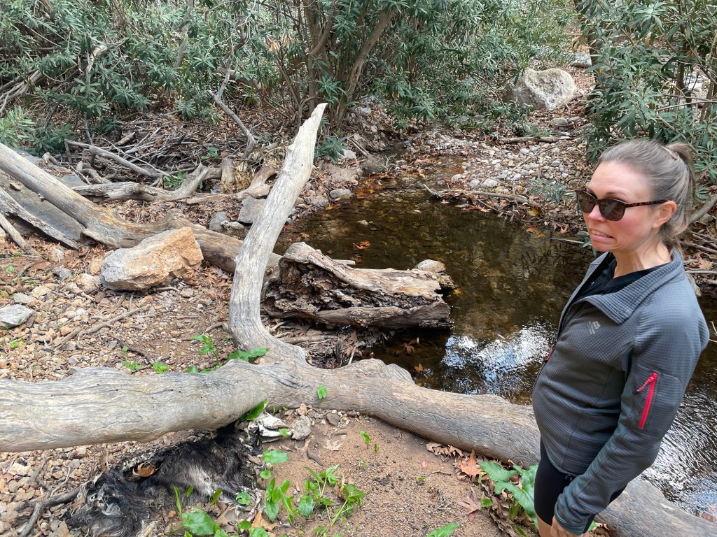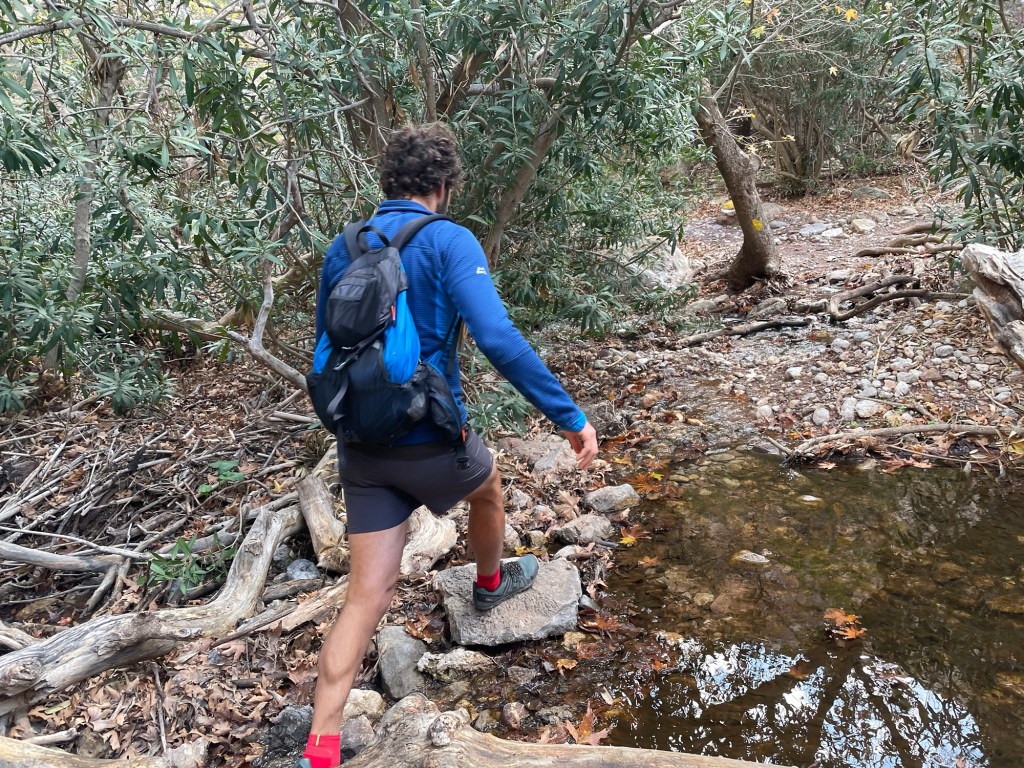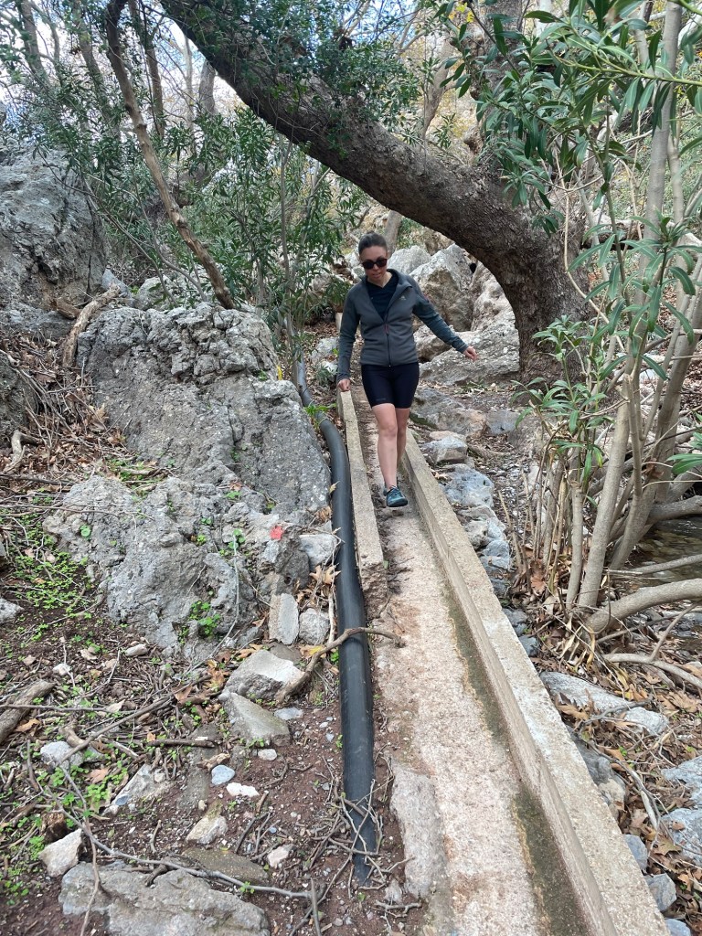 We soon found an old concrete aqueduct, that had been superseded by a black rubber pipe. The path was narrow and rocky and we crossed the river a couple of times on stepping stones. We soon reached a pool where the water seemed to go off in a different direction. To the left was a marked trail that looked exciting and to the right was the equally enticing gorge.