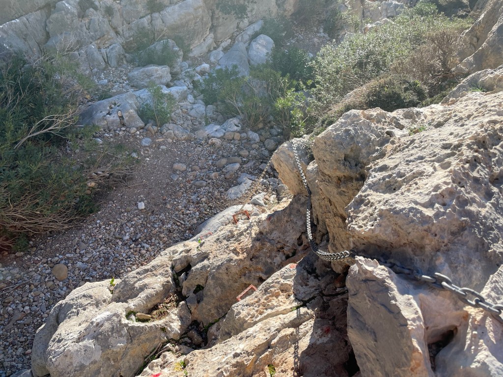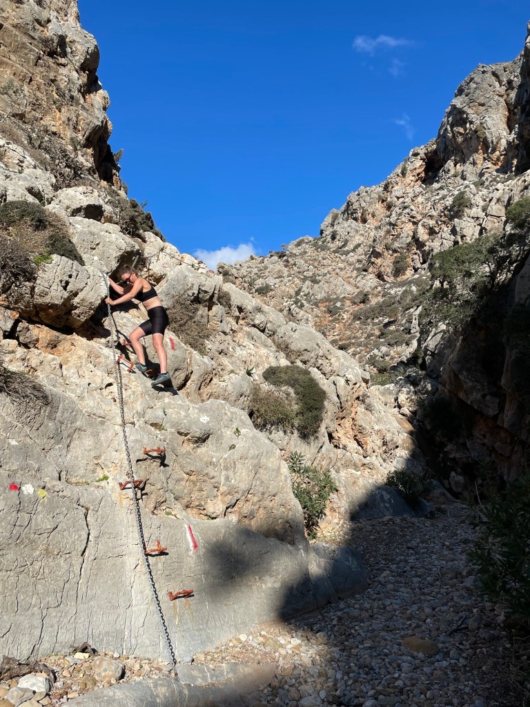 After we set off again we almost immediately came to find ourselves high up on the rocks and the path dropping several metres below. It made no sense at first and seemed rather perilous so we hunted for the markers. The route actually traversed down the rocks using screwed in handles and a chain. We weren’t wrong about this being an exciting route.