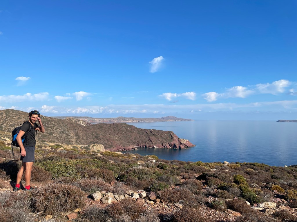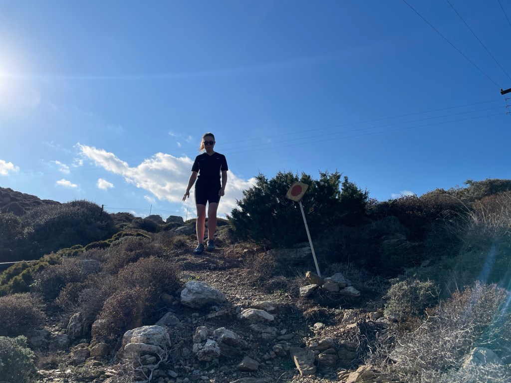A short interlude in the path, on a dusty road, led us towards Maridati beach. Just before we could see the sea we took a left onto a trail that, after a gate, headed up a very steep rock face. If it weren’t for the red dots marking the way, we would doubt the existence of a trodden path. We climbed high above the beach, and could see all the way back to the house.