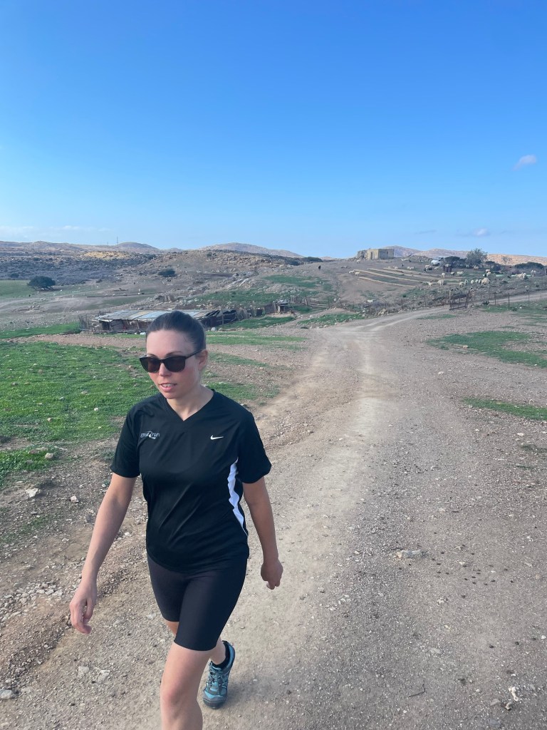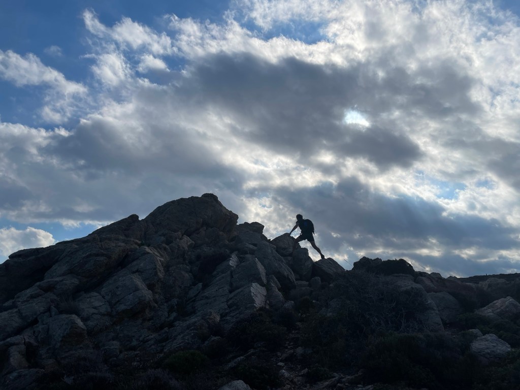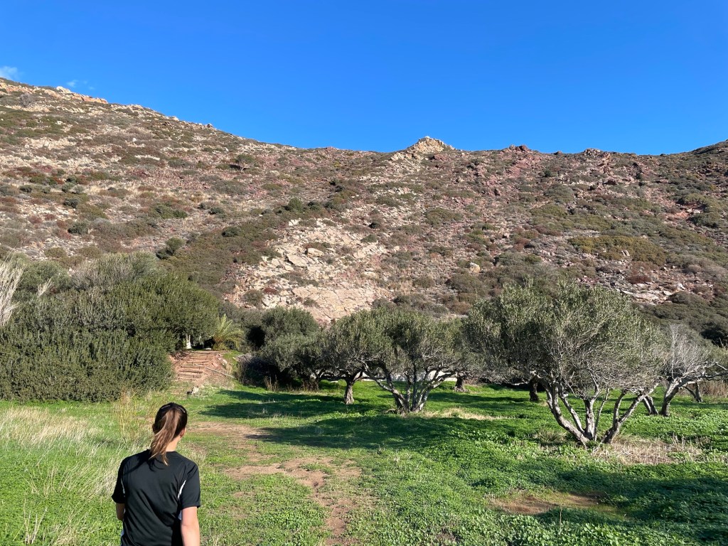We left at the back of the car park. It was marked, at least to start with. But after walking up the dried up valley for a while we realised there hadn’t been any more markers. Openstreetmap let us know the path was actually up the hillside. We scrambled up to meet it. Got to the top of the hill. And promptly lost it again. The markers were too intermittent to follow.