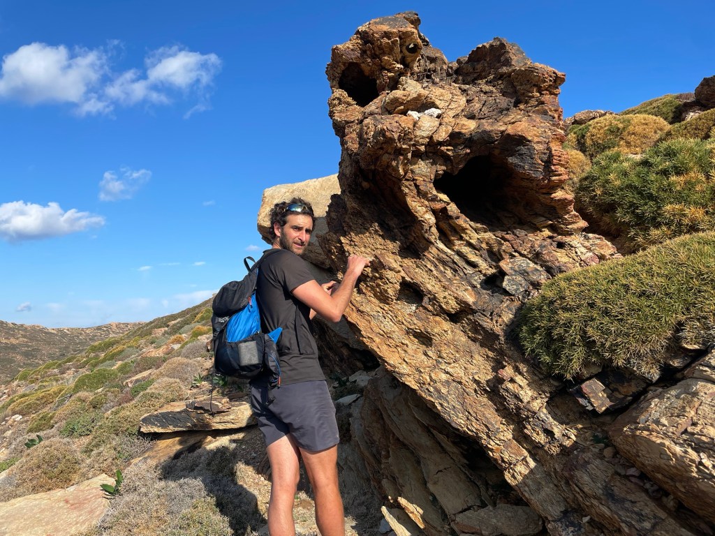 We were walking along a ‘Georoute’. The geology of the island is so impressive that there are many specifically planned routes that take in the different rock types and their formations. There is a small beach just before Βάι called Psili Ammos. It’s about twenty metres wide. But the sand there has a mind boggling depth of 200m.