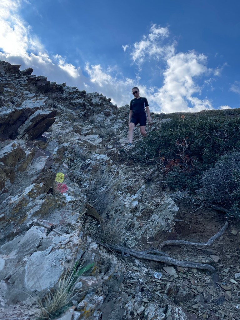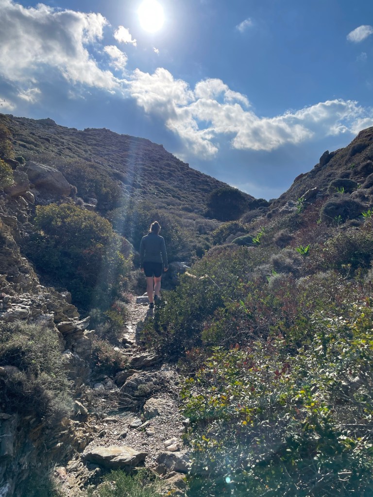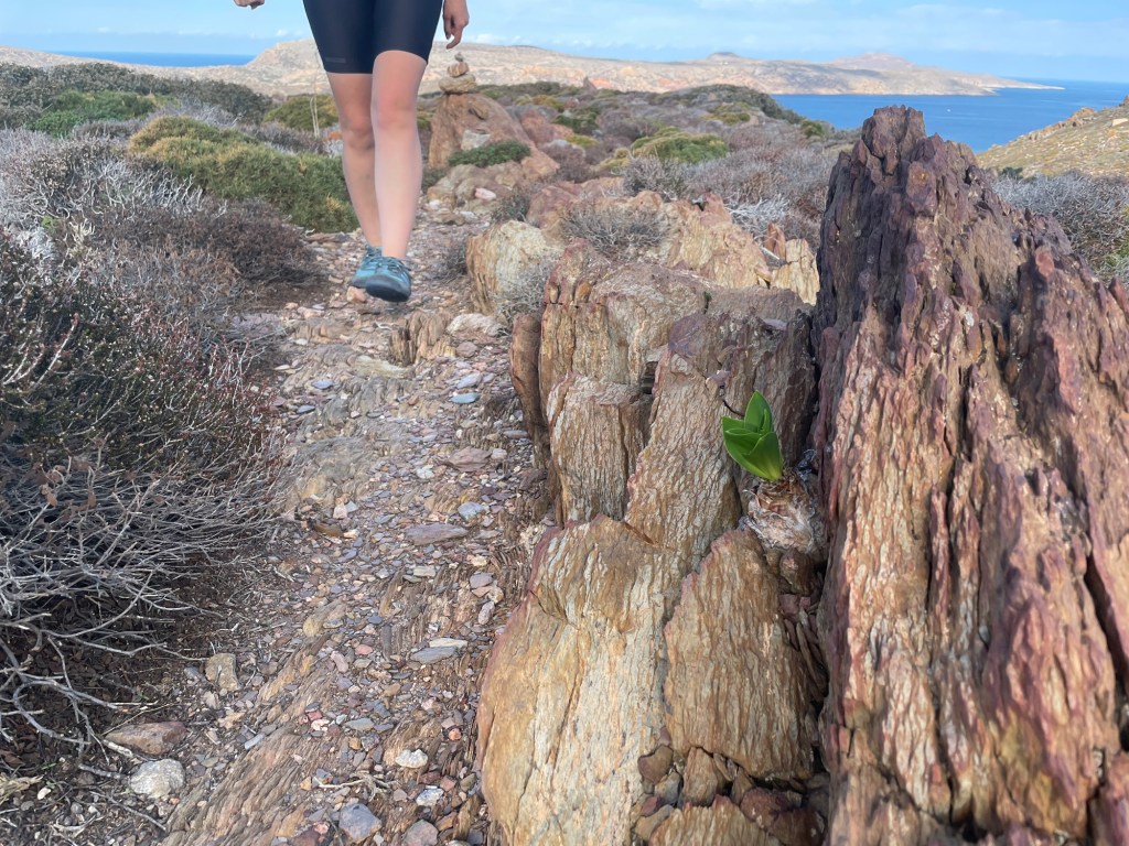 Just next to the marina there was supposed to be a path. After following red dots the day before, we immediately spotted one by the road. This must be the right way. It seemed a little random, just heading up off the road but it met a little track and then headed down a steep winding rocky path. After the day before, we should have been prepared for this.
