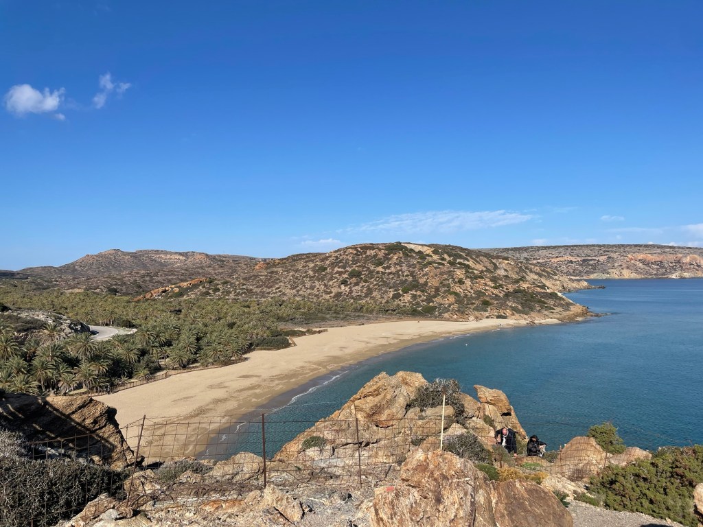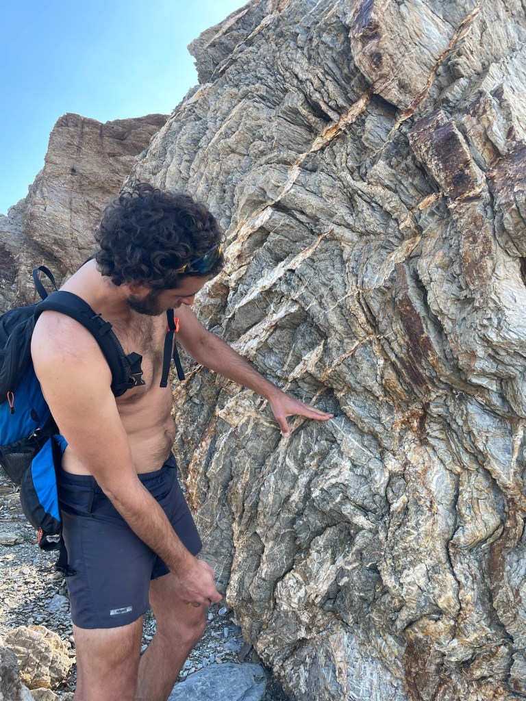 We were enjoying the hot sun when we got to the viewpoint above Βάι beach. There’s a viewpoint which is as far as most tourists make it. We saw a man wearing a puffer jacket. It was 18C and he made us feel even hotter. By the viewpoint was an incredible rock fold.
