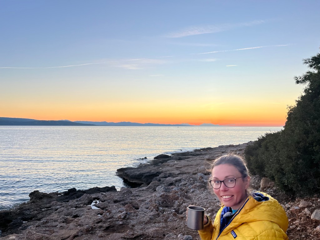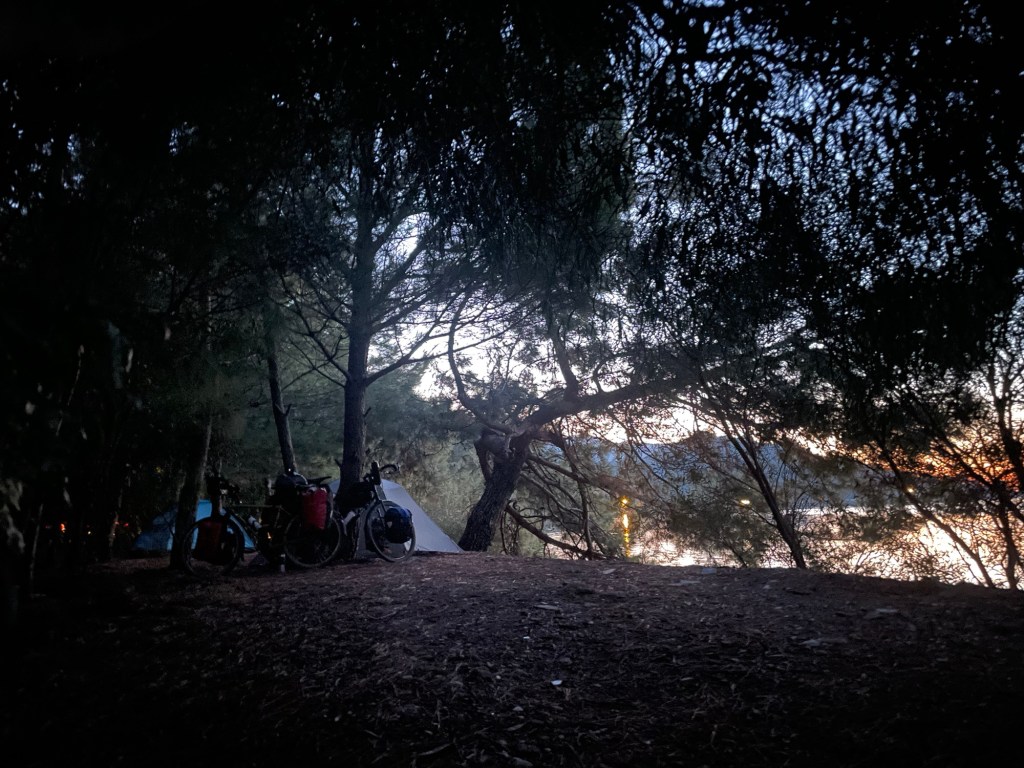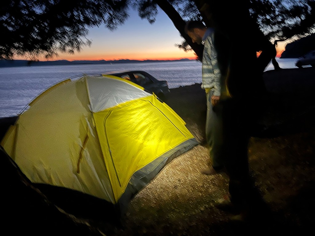 We set our own tent up and because it was so rocky used two tarps underneath. In the tent we ate some nuts and a pack of chocolate wafers that had cost 5 Lira. 11 pence. That is cheap. The Moon was out so the crystal clear sky wasn’t quite showing all the stars that it surely would be otherwise. We got our beds ready and brushed our teeth with what was probably the last of the toothpaste that we’d bought back on Monte Isola.