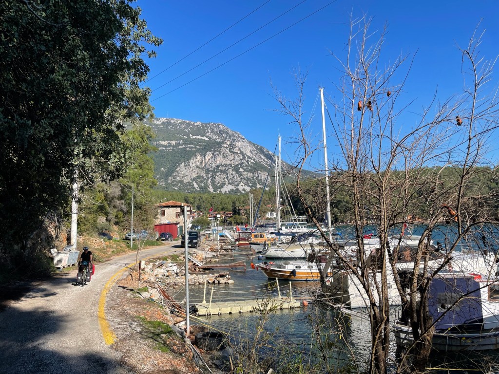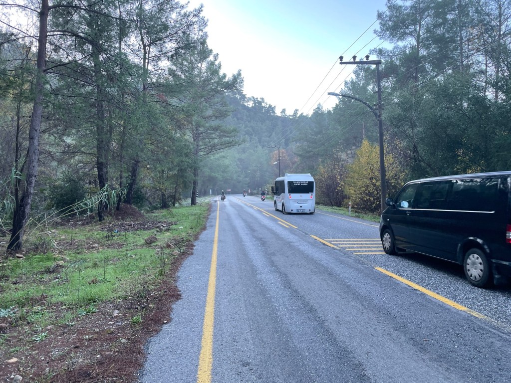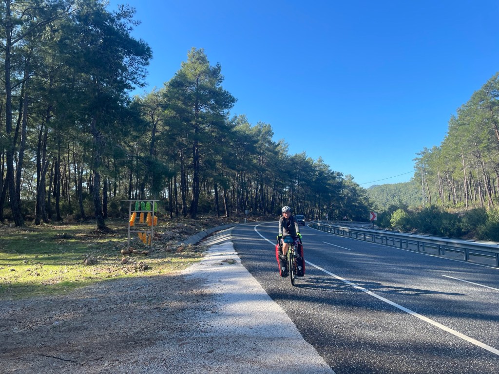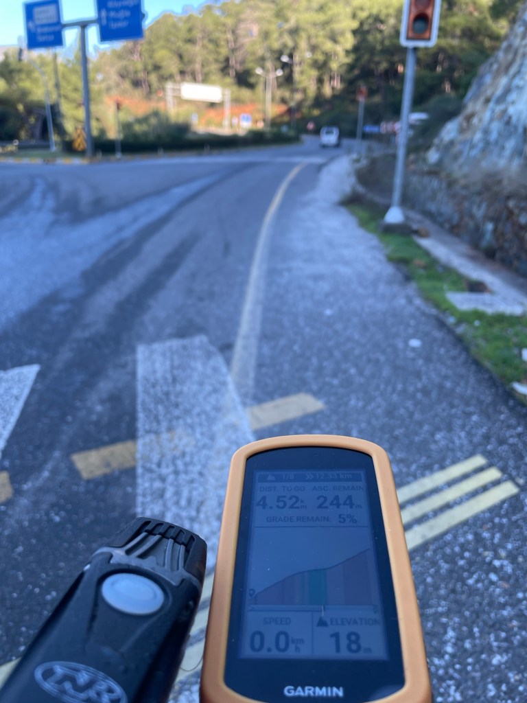 We got some Lira from the cash machine. After checking each one for the lowest charge we ended up paying 8%. Not in the EU anymore. Straight out of the coffee stop we were joining the D400. It’s a long road and varies in width and quality. The section north out of Marmaris is a dual carriageway. It sounds scary and had we not been utilising another tourers route, that he’d cycled with his teenagers, there was no way we would have planned to have been on it. We probably would have ended up on some very rough tracks through the mountains.