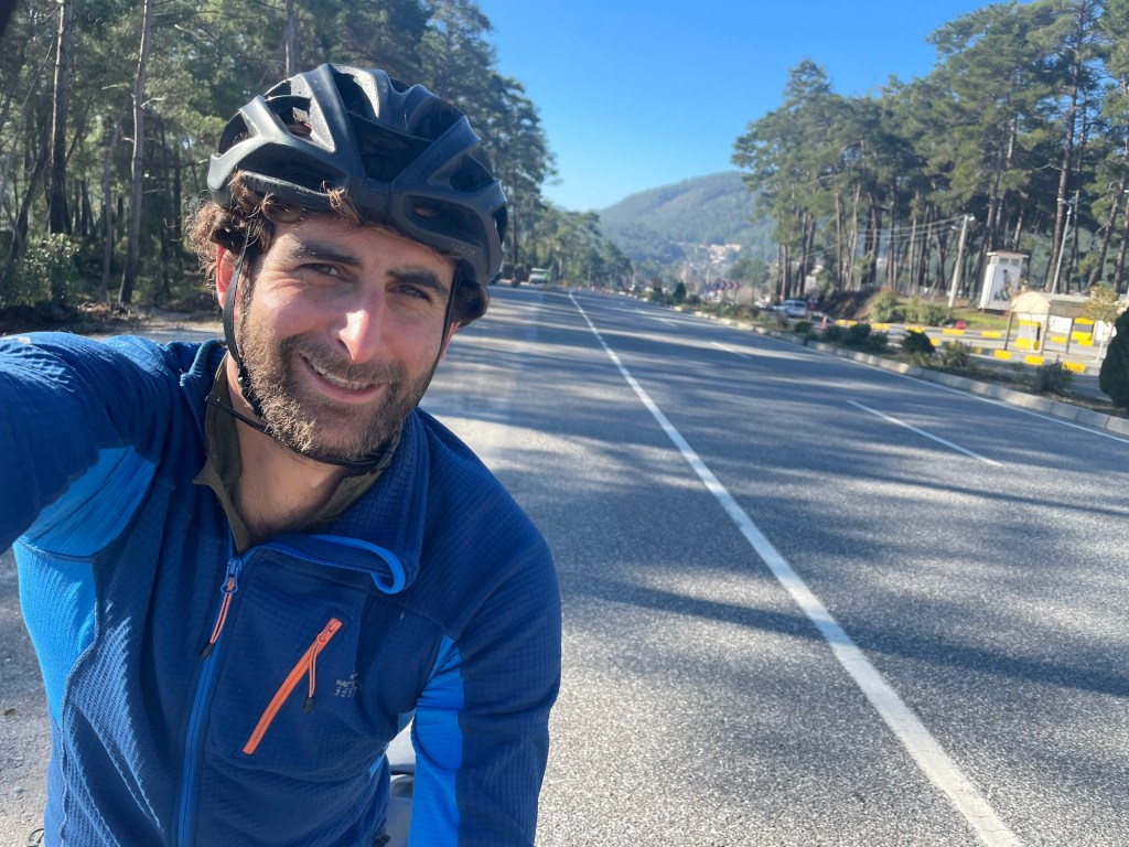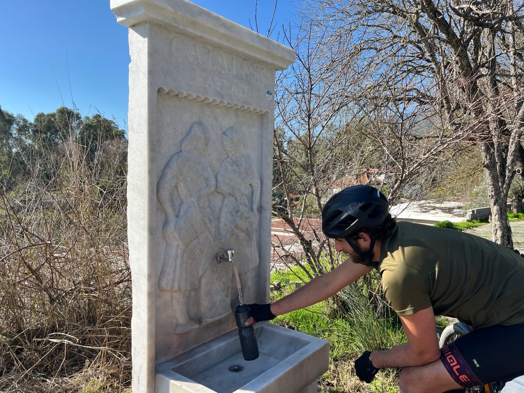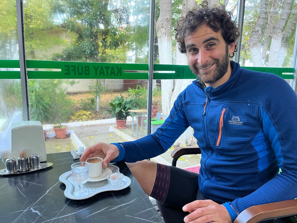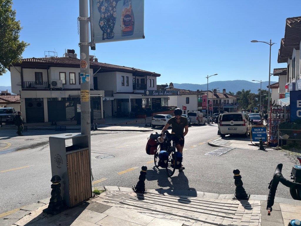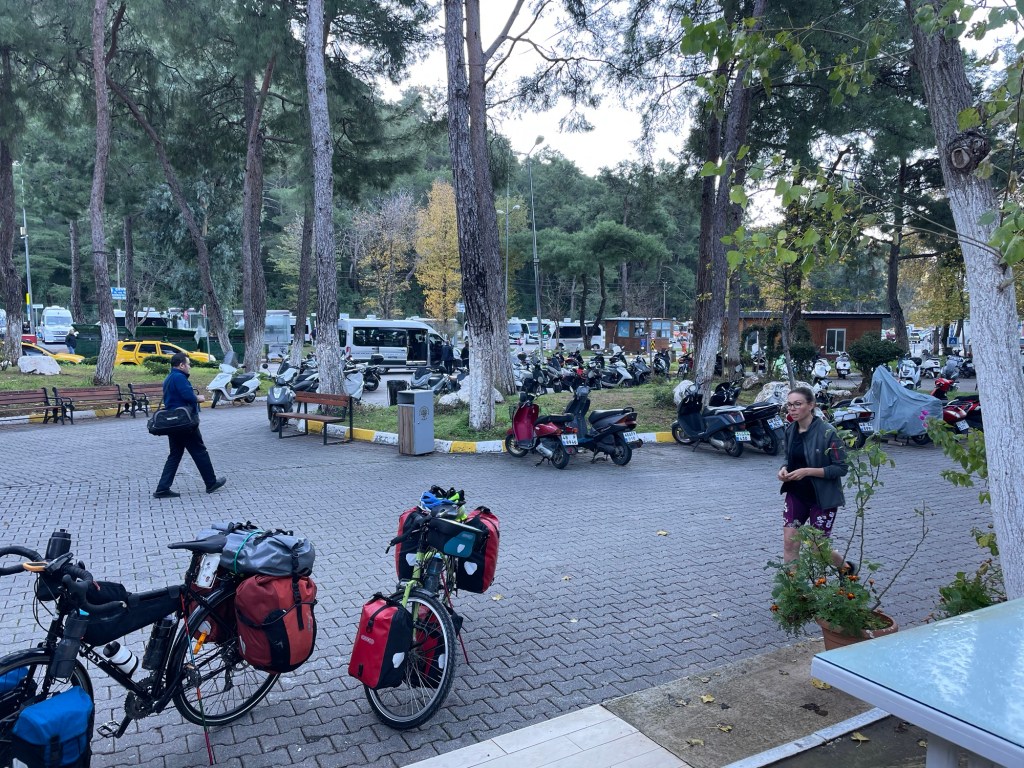 We packed up at sunrise, about 8am. Despite being so visible, we didn’t feel rushed at all. The road was getting busy. We cycled round the eastern edge of Marmaris, heading to the main road. Just before we joined the D400 we stopped for a Turkish coffee at what appeared to be a bus terminal. It’s unfiltered. So you’re meant to swirl it occasionally and it’s meant to be grainy. You’re drinking the grounds. The smartly dressed cafe owner asked if we wanted sugar, as it’s added during the brewing. Frankie did so. Jonathan did not. A young man brought it over. A little glass of water to accompany the rich coffee.