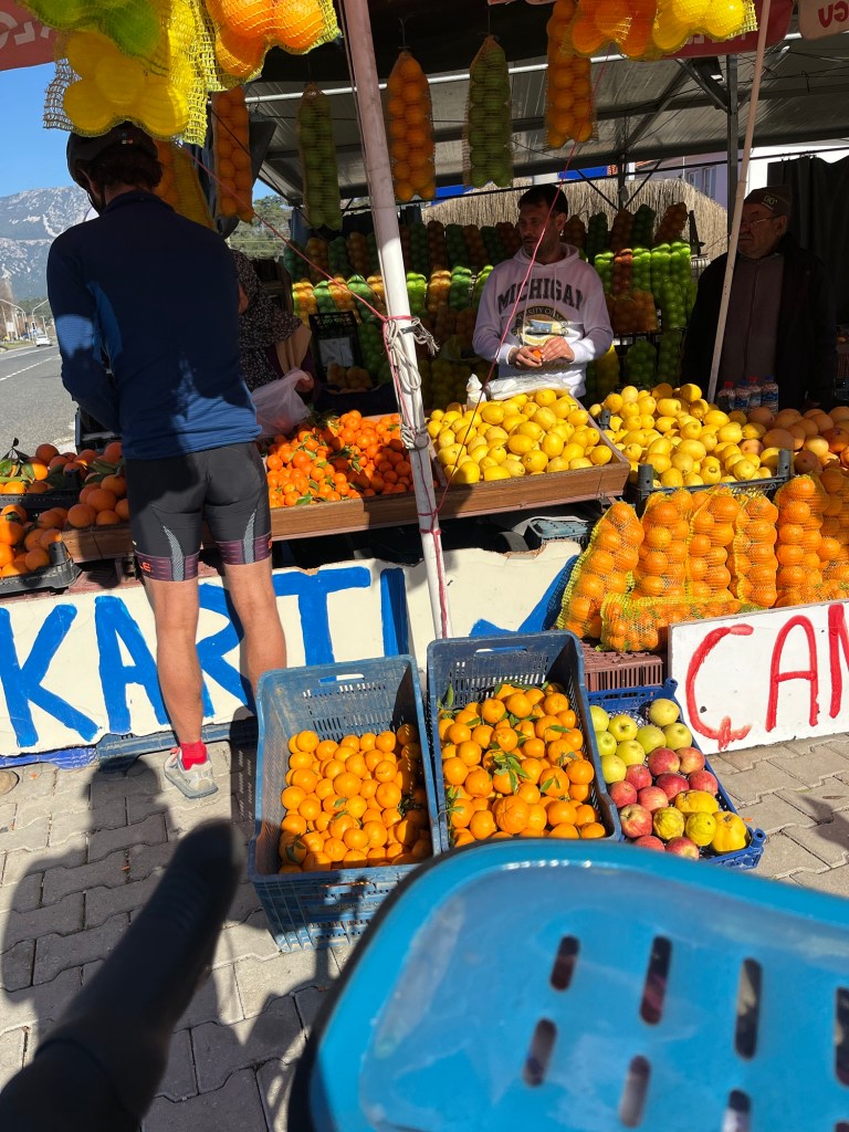 Again we descended. Even steeper it felt. Being from the UK we just aren’t used to such mountainous main roads. At the bottom was a straight stretch, flanked by fruit stalls. We stopped at the first one and they had many jars lined up. There was an old lady sat there but soon her husband and, kind-of English speaking son came out. In the jars was ‘pine’ he said. So we assumed some kind of pine syrup. We asked for a smaller jar, and he rummaged out back to find one. He suggested a little taste and we obliged, it turned out to be honey! We felt like bad vegans. But it was too awkward to change our minds. We bought a few oranges too.
