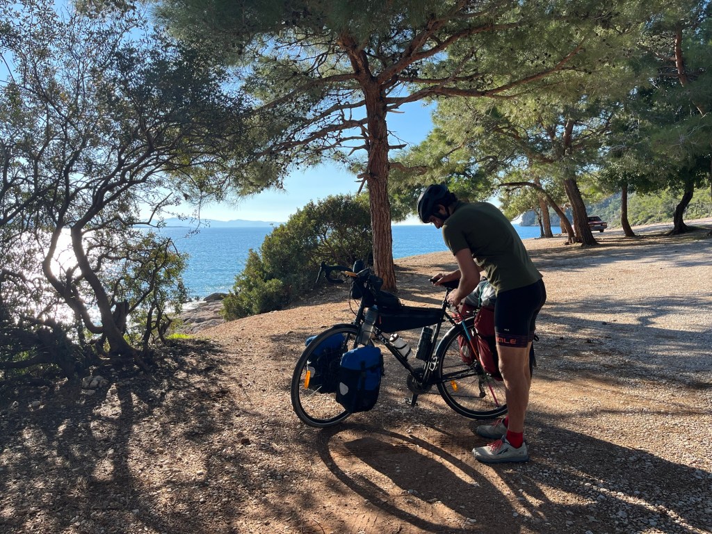 Out of the village the road was a mix of cobble and tarmac. The secondary roads weren’t as smooth. The scenery was spectacular as we joined the tiny coastal road to take ourselves west. It was a winding narrow road that undulated frequently. After 10km we started looking for a campsite. It was only 3pm but we’d had a good day and we knew there were a few good spots marked on google maps. It’s a culturally popular pastime in Turkey. They like to camp. And picnic. So there are beautiful spots. Open and free for all.