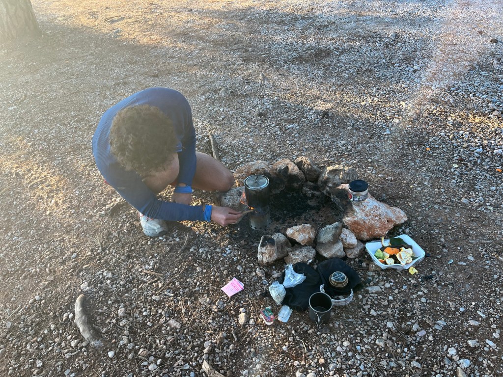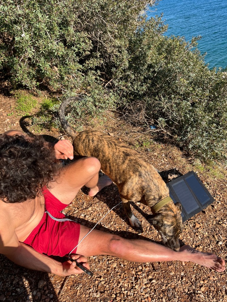 We had a quick dip, just our legs really. The water wasn’t scorching or anything. was a couple of hours till sundown, so we sat on the bank to relax. It was so sunny we even had the solar panel out to charge our power bank. For dinner we had bread, mini cucumbers, avocados (which were a bit too firm) with what turned out to be salsa. There was a friendly dog, that we decided to call White Paw, milling about and she was very polite and didn’t try and steal any of our food. She just kept trying to shake our hand.