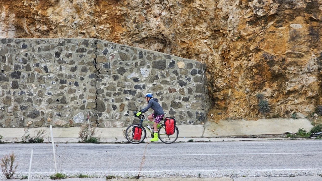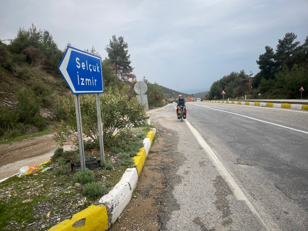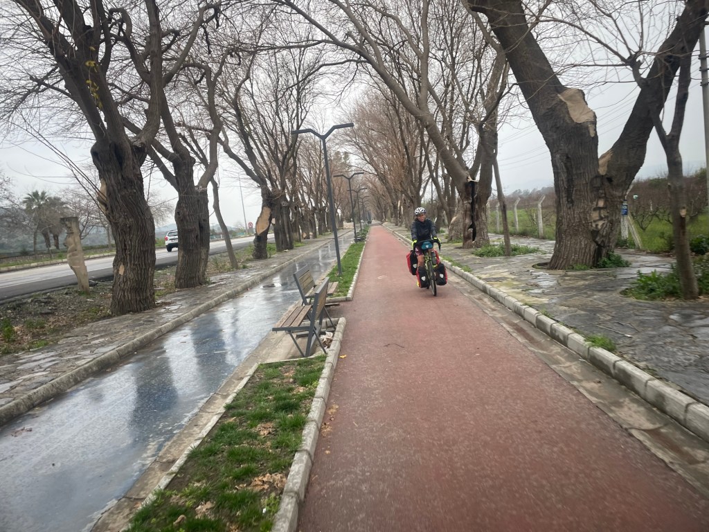 The road climbed a little higher before it was meant to be downhill. Except the wind was strong and the road surface rubbish. It felt flat at best. Certainly not 6% as it was advertised. The rain started too. We risked a shortcut between the highways which paid off and then pushed hard along the straight road to Selçuk. We could see Ephesus on our right side. As we passed it. A cycle path began. It was EuroVelo 8 again! It has a small section in Turkey too.