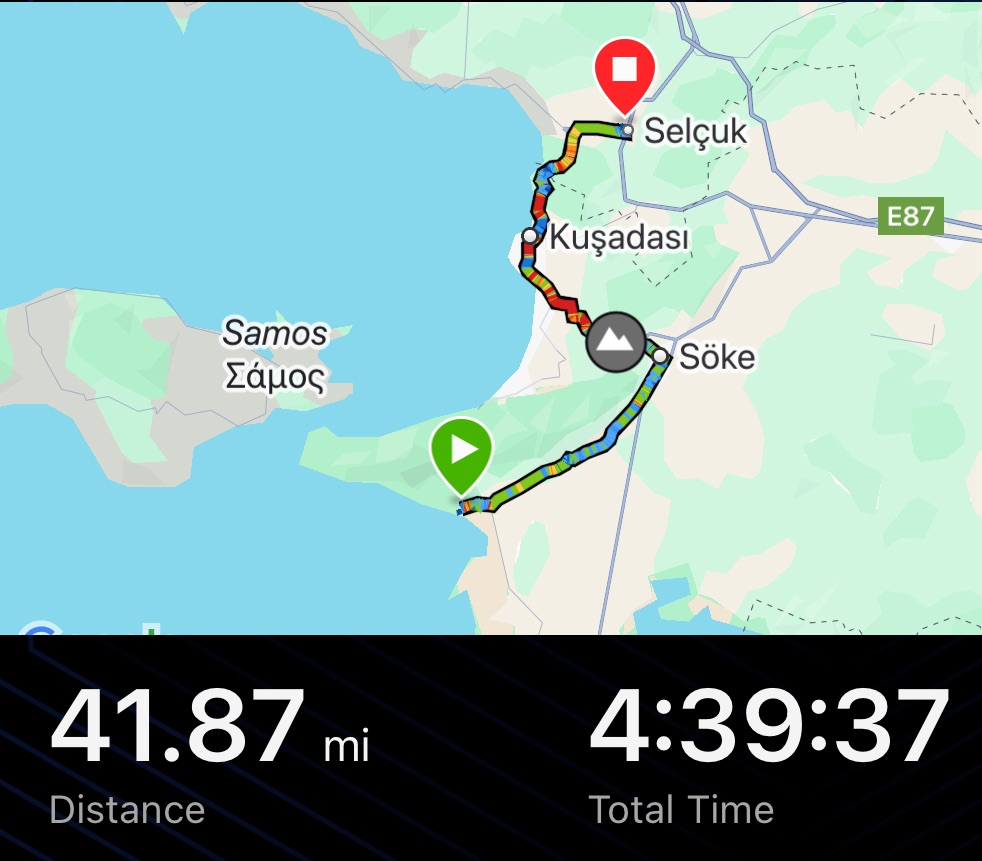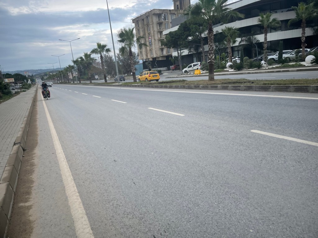 The descent was big. We held on for dear life as the road headed into the large resort of Kuşadası. We assumed this would be a nicer route as it was coastal. Perhaps we should have taken the inland route. The road was super busy and not wanting to add elevation we didn’t leave the highway. The best way to describe it is as like riding the A406, the London north circular, huge overpasses, no hard shoulder. We stopped at one point to rethink it but with only 2km left we soldiered on.