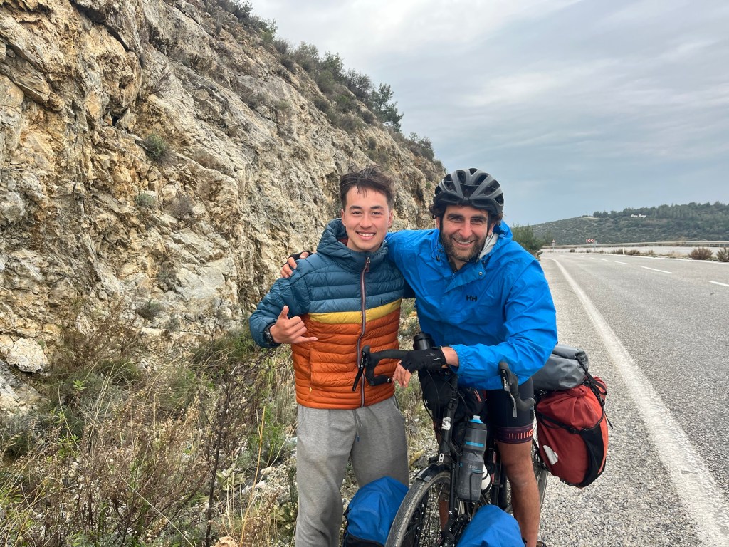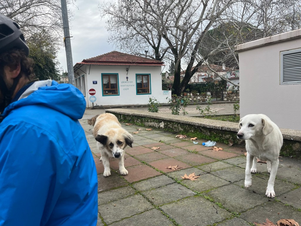As soon as we left the city limits the road deteriorated and so did the amount of traffic. We were about 15km and 100m of elevation from Selçuk. It felt like an assured destination now. We knew Quinn had been staying nearby but didn’t know if he’d still be here sheltering from the rain. We called him. He was at the campsite, but down below the highway. But it’s Quinn, so he said he’d climb up.
