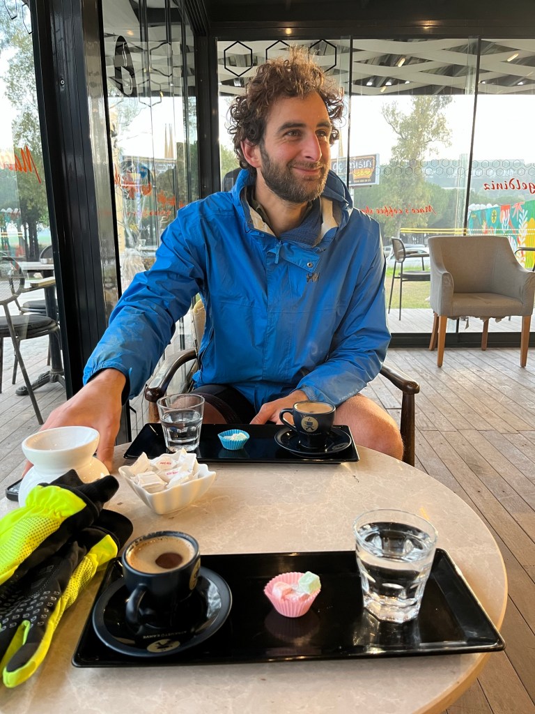 It was enough to ensure we weren’t going back to sleep so we packed up fairly swiftly. At least 50 bus and coach loads of people were arriving at the complex. It was probably more. We’d spied a little coffee shop by the petrol station at the bottom and hurried there. The barista was super friendly. We ordered Turkish coffee after staring for a minute at the menu full of americanos and lattes. We sat for a bit enjoying the western music he had playing, it reminded us of home. He offered us çay which we gladly drank. Then he brought us a potato bun to try, and more çay. His treat. We were blown away by his kindness. Not in a million years at home.