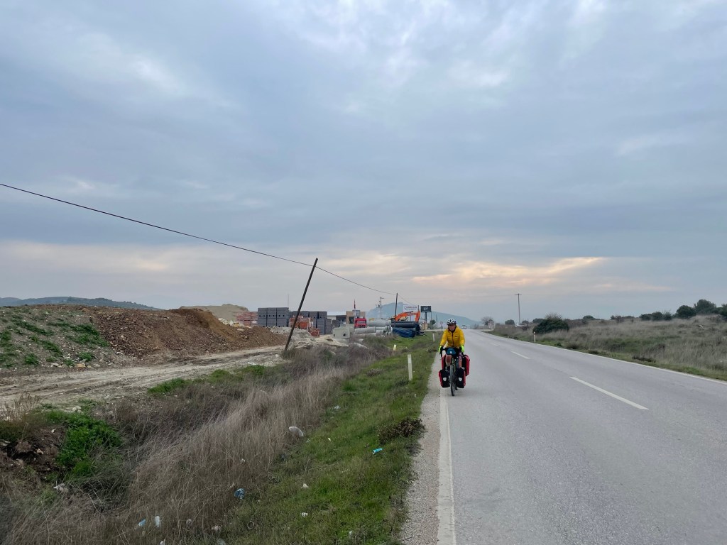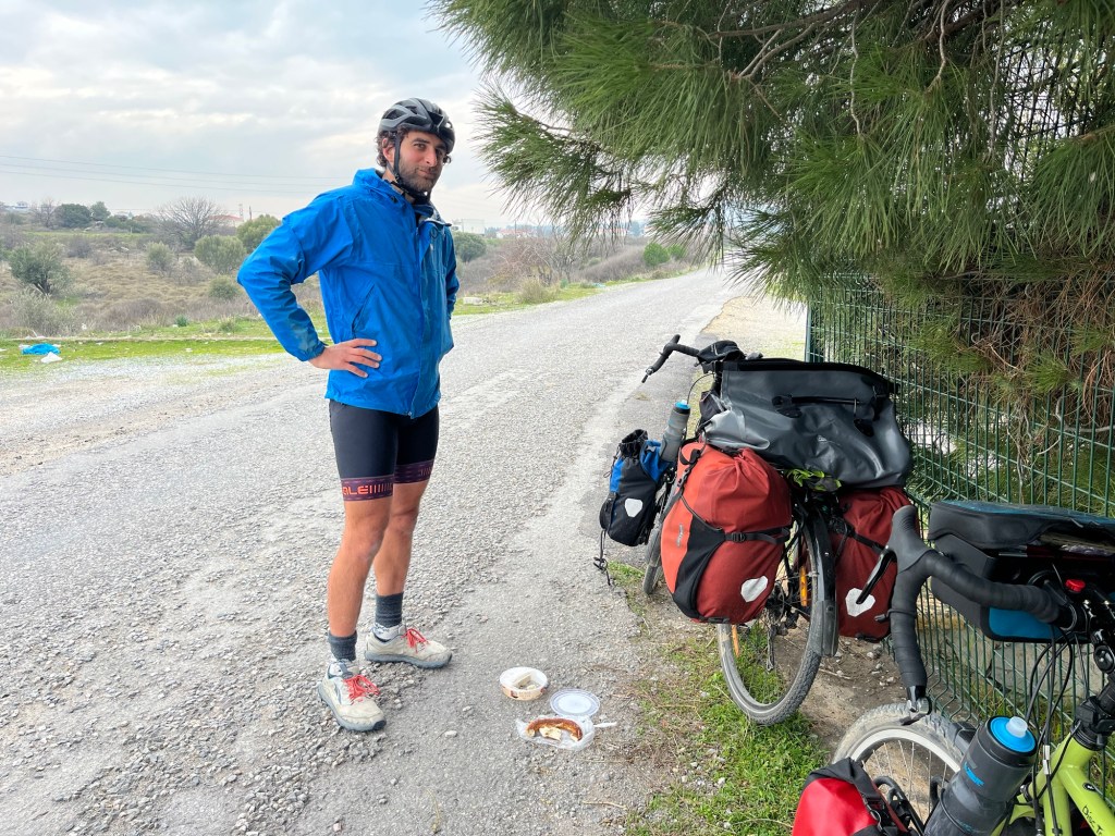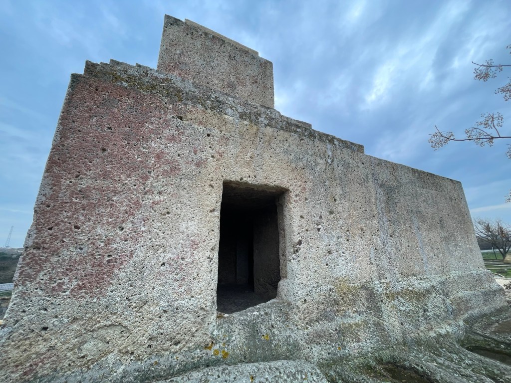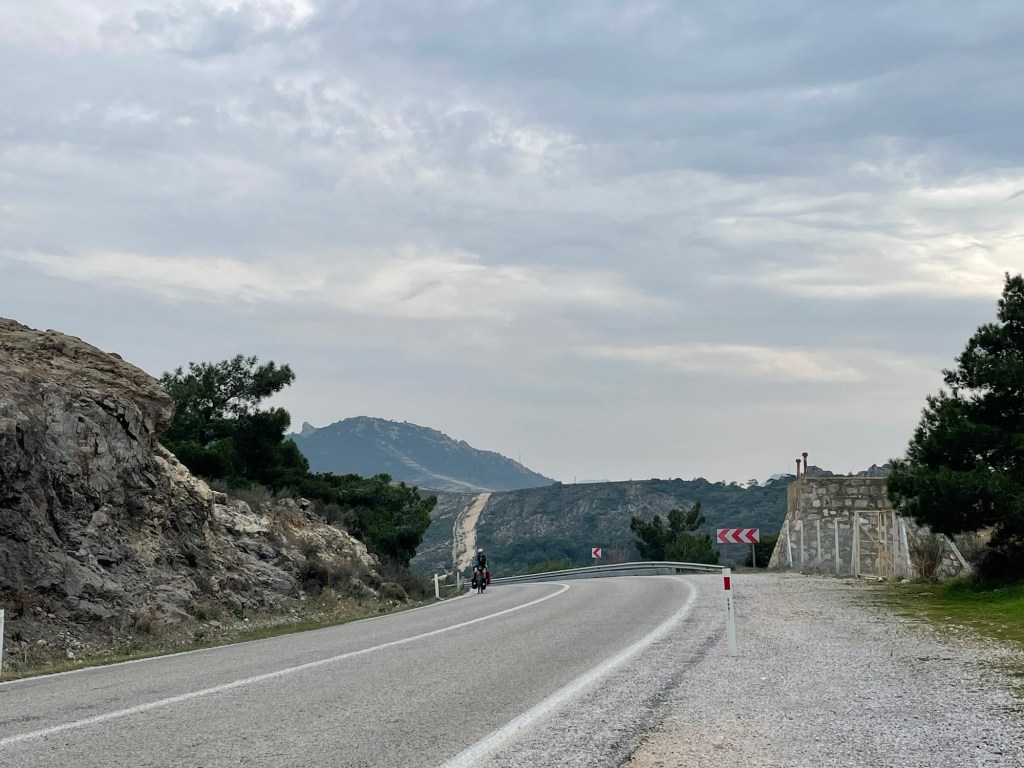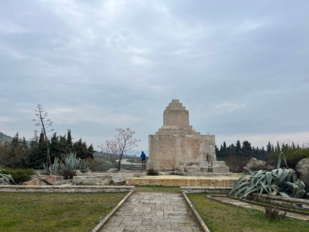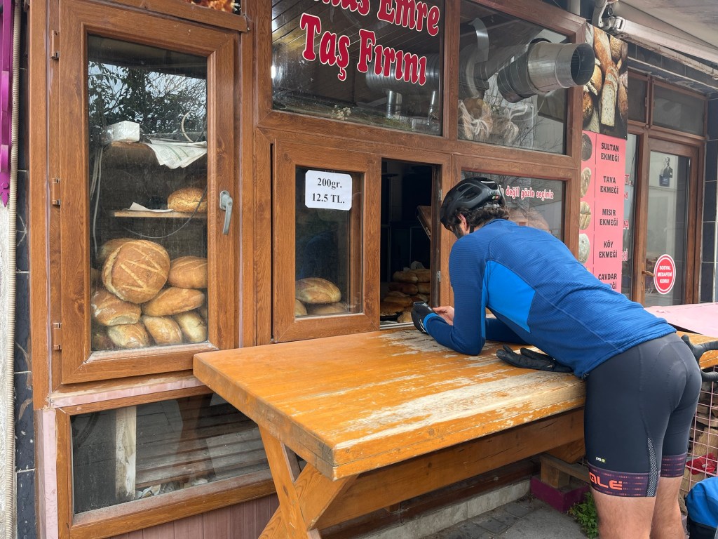 We had to get moving eventually. The road wasn’t as busy as it had been first thing in the morning. We stopped to buy ekmek from a bakery. More delicious sesame rings and flatbread of some description. More flat lands to cover first but it didn’t last long. We went past a tomb that was built during the Persian rule of Anatolia. Entirely carved from one piece of monolithic rock, burial chamber inside and all. Amazing. We shared a sesame ring with halva.
