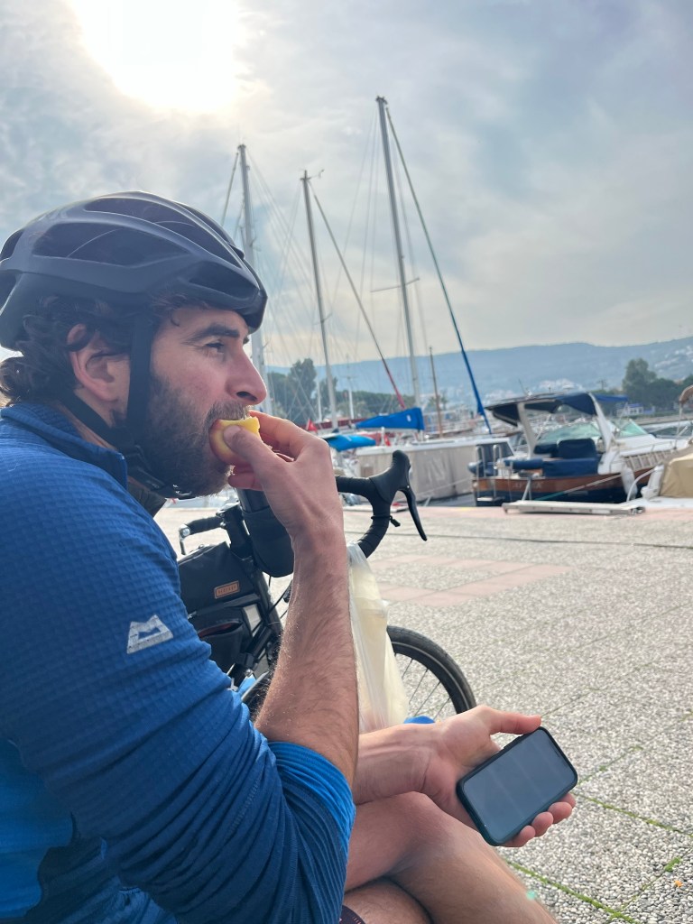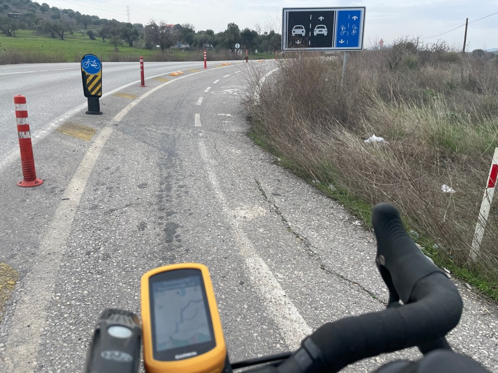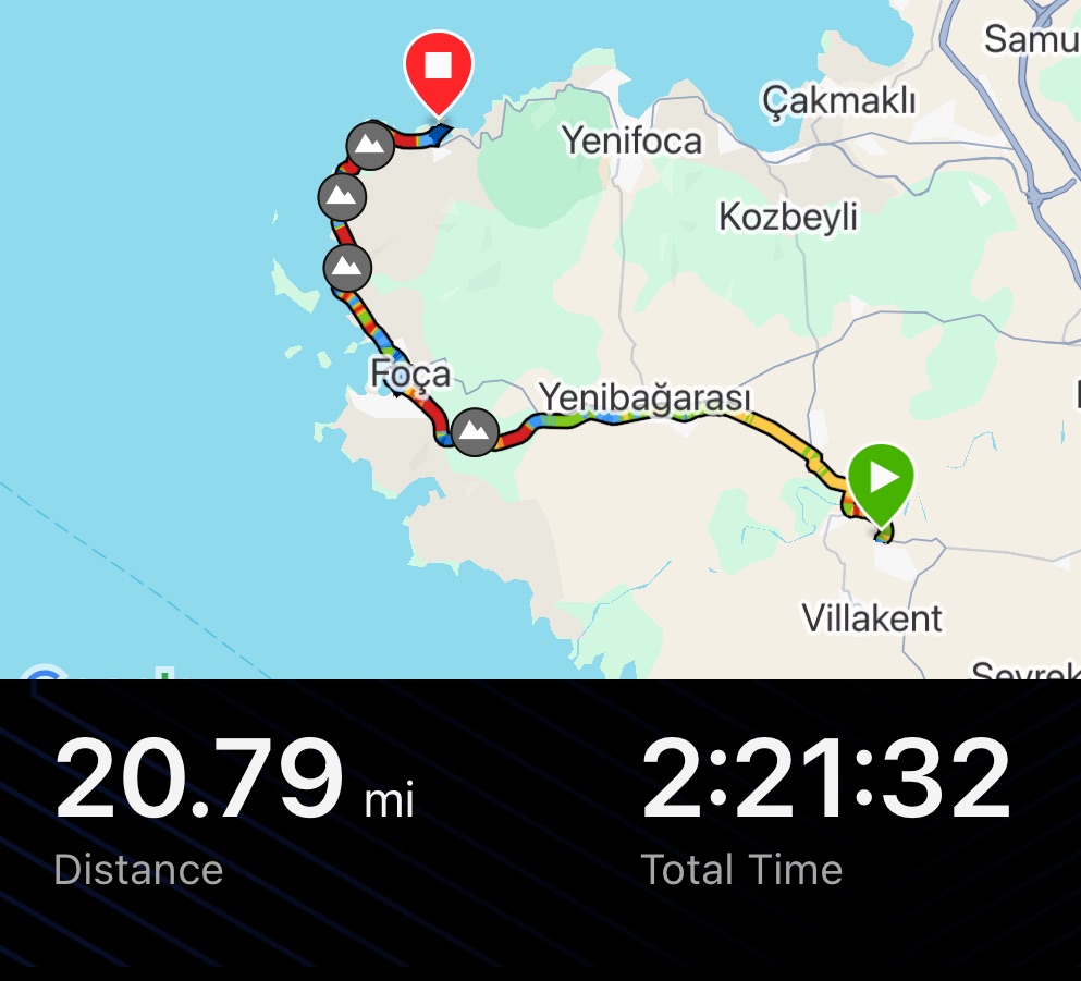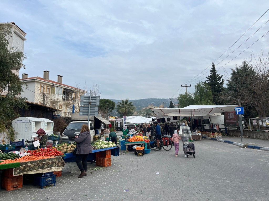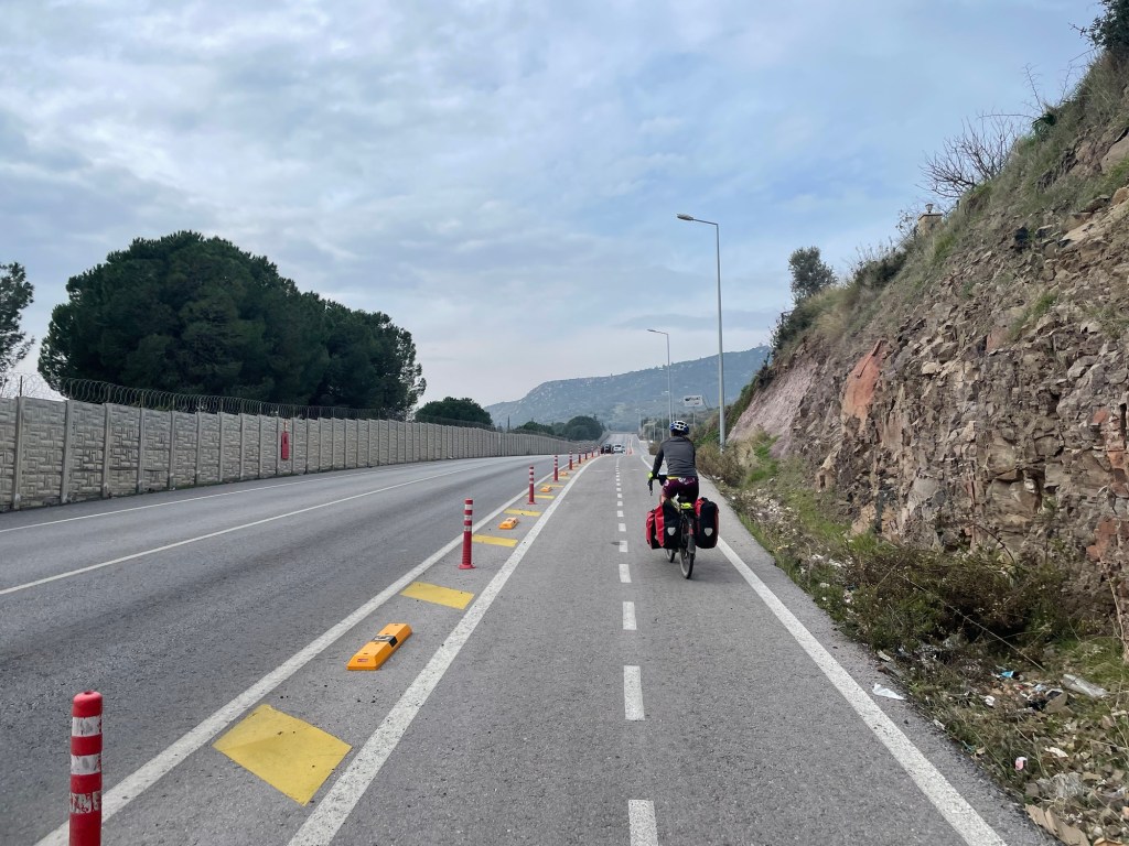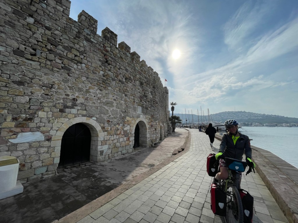 We soon took the turning to Foça. Actually both roads went there but this was the quieter road and had an excellent cycle path. There was the first climb in a while too, but then a rushing descent into the town. We passed city walls and windmills on the way down then stopped by the market, prices were cheap again. A kilo of blood oranges and a kilo of apples all for about £1.50. We crossed the cobbles to the harbour and sat on a bench gorging on the fruit.