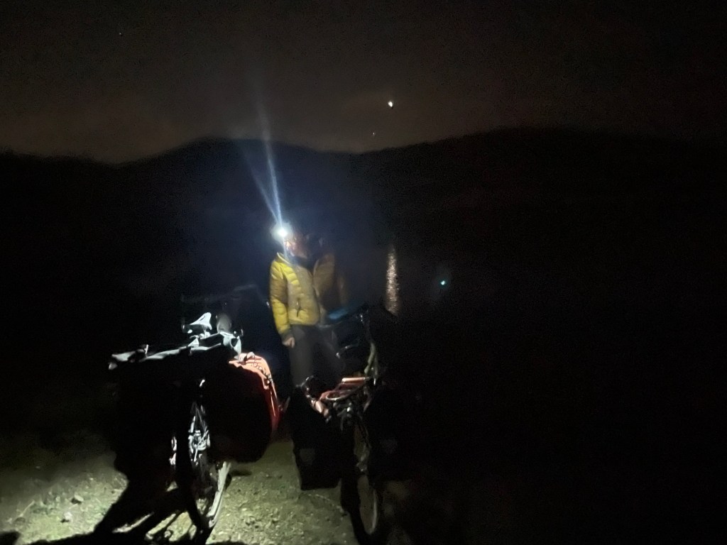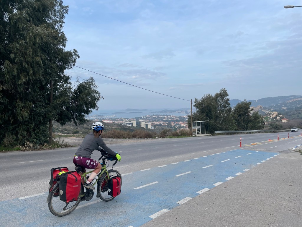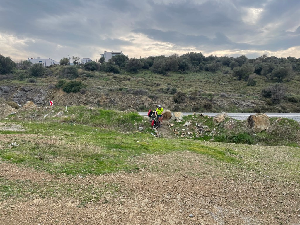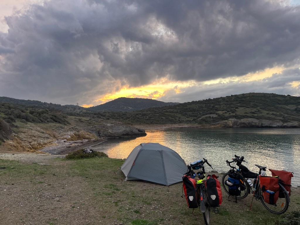 We pushed our bikes up and down the rocky tracks as far as we dared to find a flattish area for the tent. It was just above a beautiful cove in the bay. It was a far cry from the day before, and even though we’d only covered 33km we didn’t care. The stove was duly lit and we boiled some lentils, we’d been carrying them since Crete, and ate them with plentiful bread and salad. Afterwards we made tea, deliberated on the best site for the tent, grassy but knobbly or flat and rocky (we chose the latter), and sat outside as darkness fell.