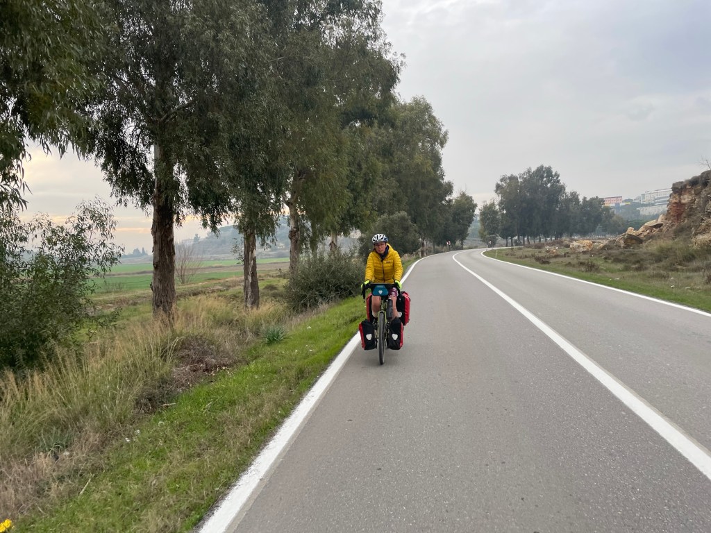 We’d got very used to the flat but now it was time for some spiky hills. 70m at a time, 7%. We took a break at the top of the second one, the third one was only a kilometre away downhill, mere seconds. There was a peninsula just before Fatiha, it looked ripe for exploration and camping.