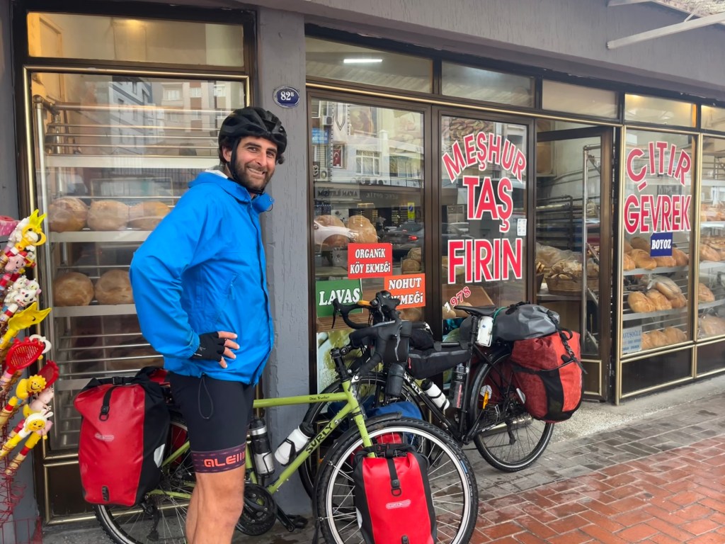 Back at the house we drank coffee and then Arjumand wanted to feed us. We had to inform him of our vegan diet, and he brought a plate of tasty slighted toasted bread with a bowl of olives, dried red peppers and lots of olive oil for us. Murat served us garlic covered carrots and broccoli. We were happy to wolf this down while talking about religion, family, cycling, littering and careers. Murat had managed to comfortably retire by the age of 50. Arjumand was 70, and didn’t think it was good for the country that people were retiring so early. It was also nice to hear that he was pleased his country gave lots of food to Palestine. A proper Muslim will always give to those who need it. It made us sad to be reminded that our country, which has so much, is so inward looking.