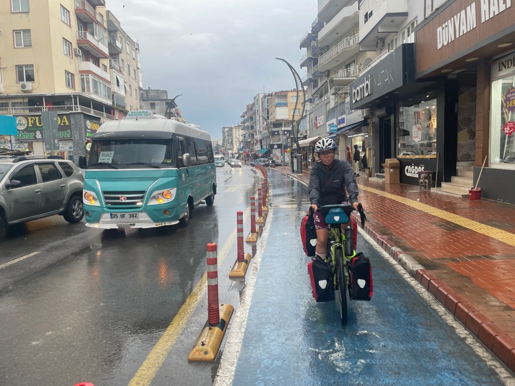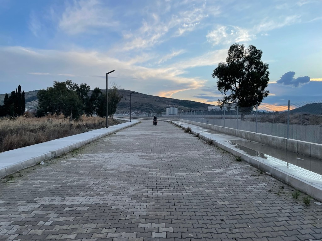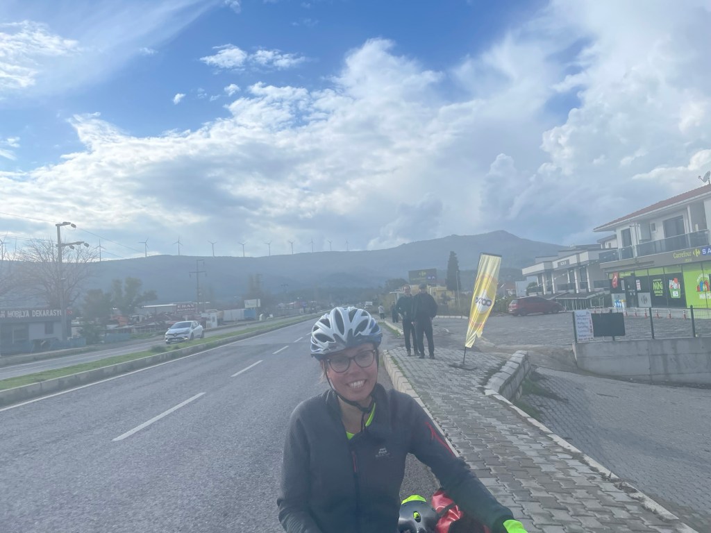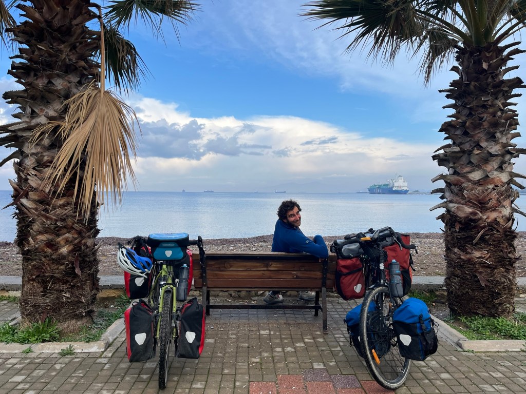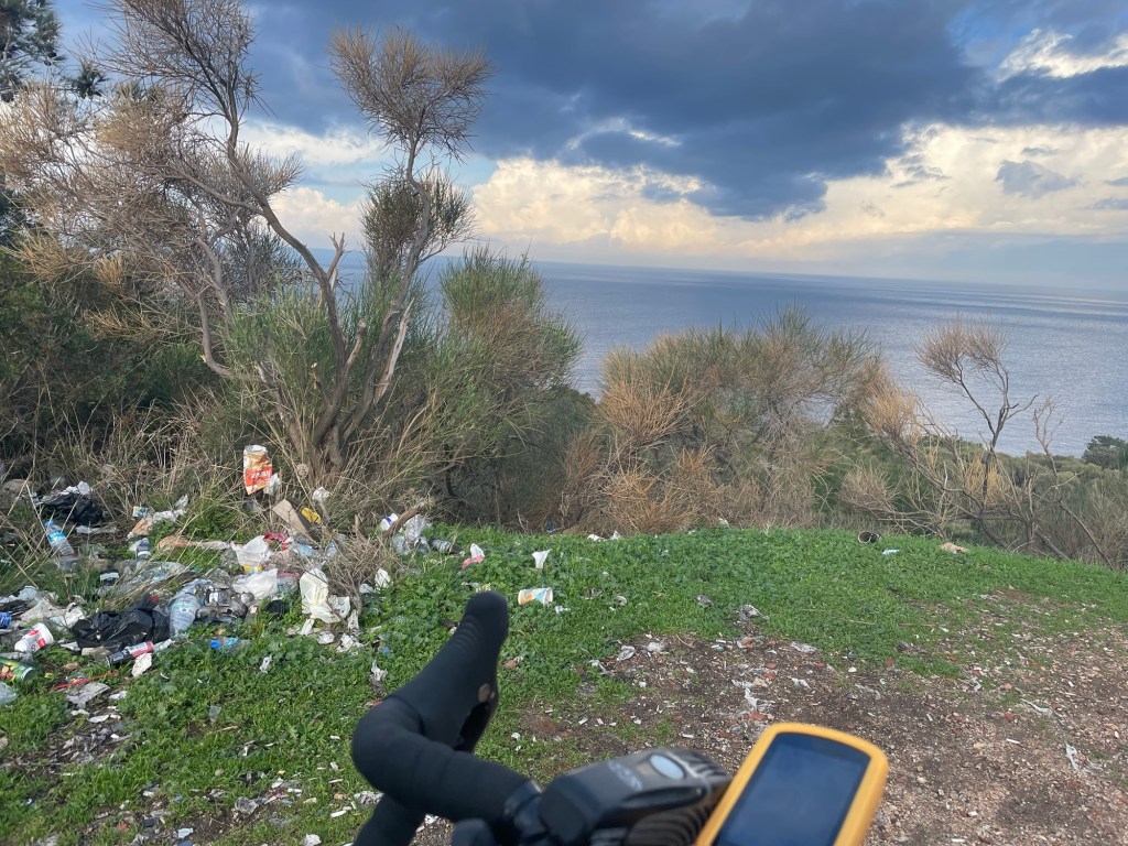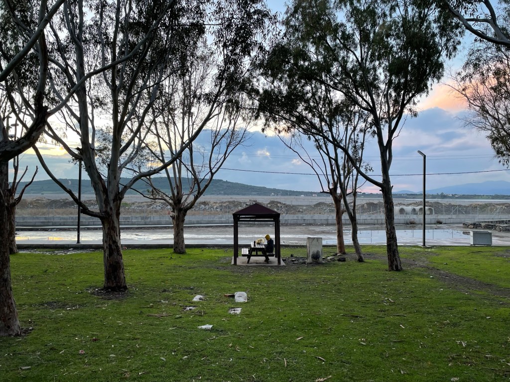 The restaurant wasn’t that appealing to us. It was probably a sandy beach with people. Not our scene but a good backup. Çaltılıdere had a little woodland behind it, near the water. There were lots of picnic benches but the areas near them were covered in glass and rubbish. We popped our bikes up top near the park where we’d put the tent, then went down to a bench to eat.