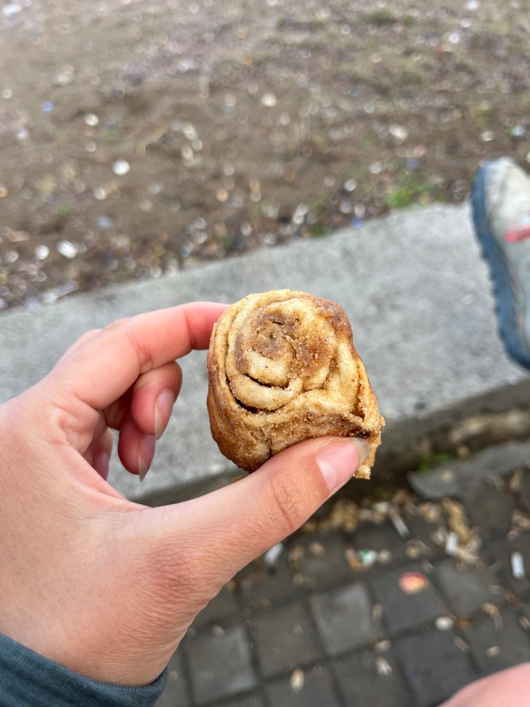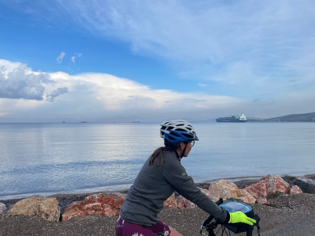 We took the next possible turning when we could cross the central reservation and went down to the water. We found a little park to sit in and eat the kind-of-like cinnamon rolls, but with less sugar and cinnamon, that we’d bought the day before with some bananas. A couple of men came over to say hello. The older man explained that his friend, who didn’t speak any English, had been expecting some cyclists to pass through yesterday and they’d wanted to stay with him but he was away.