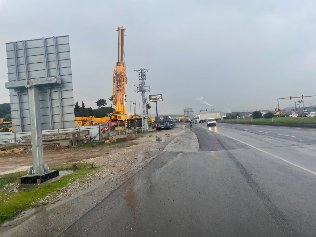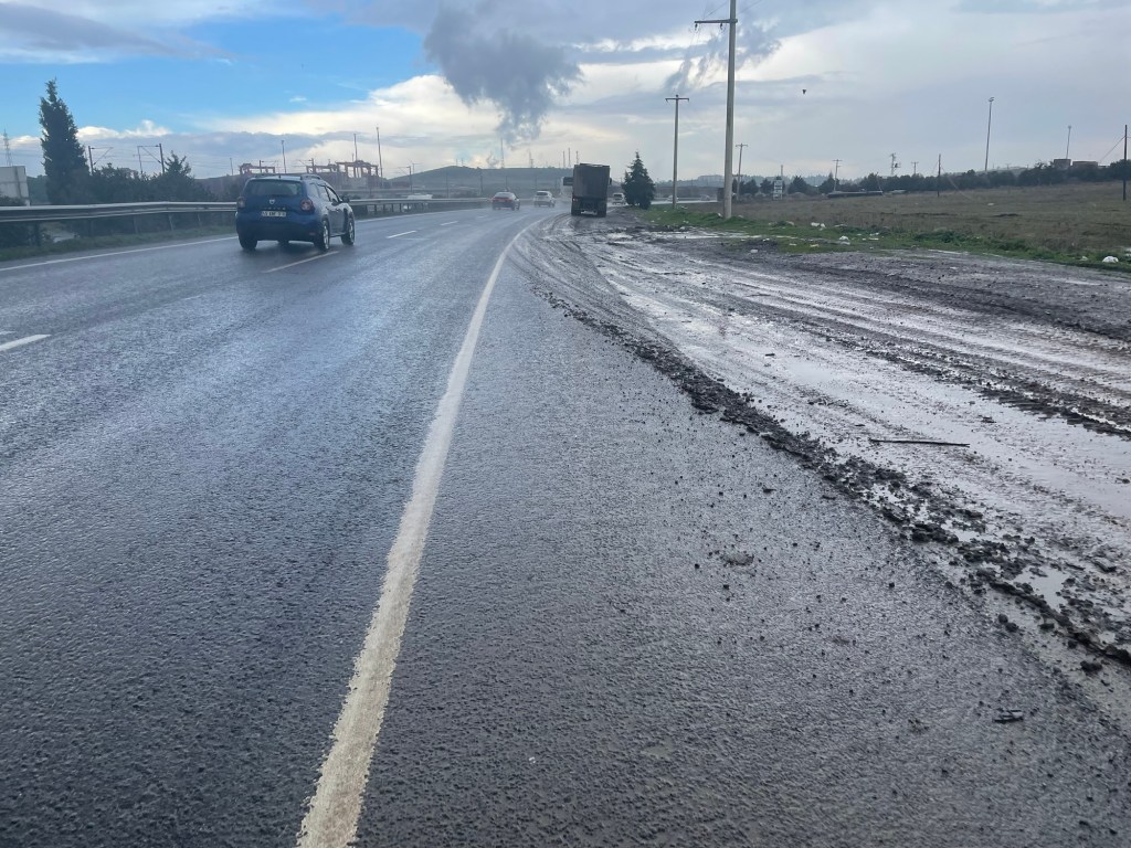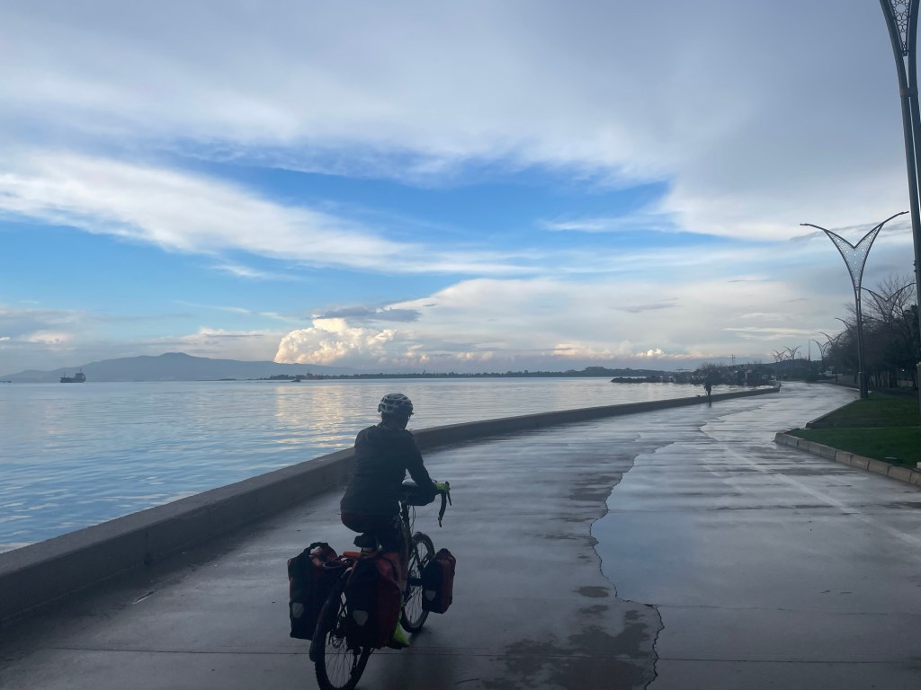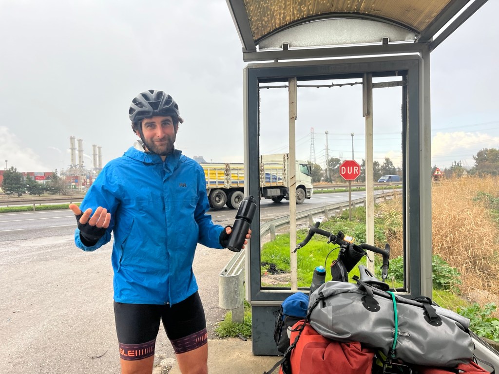 Trucks often passed us closely, this road wasn’t really safe for cycling. It felt like we were being punished. There was a massive petrochemical factory nearby, that was where Arjumand had worked all his life. Whoever thinks these places are good ideas certainly hasn’t cycled or walked near them. As we got closer to Aliaga, the road got wetter. It was like a river in some places.