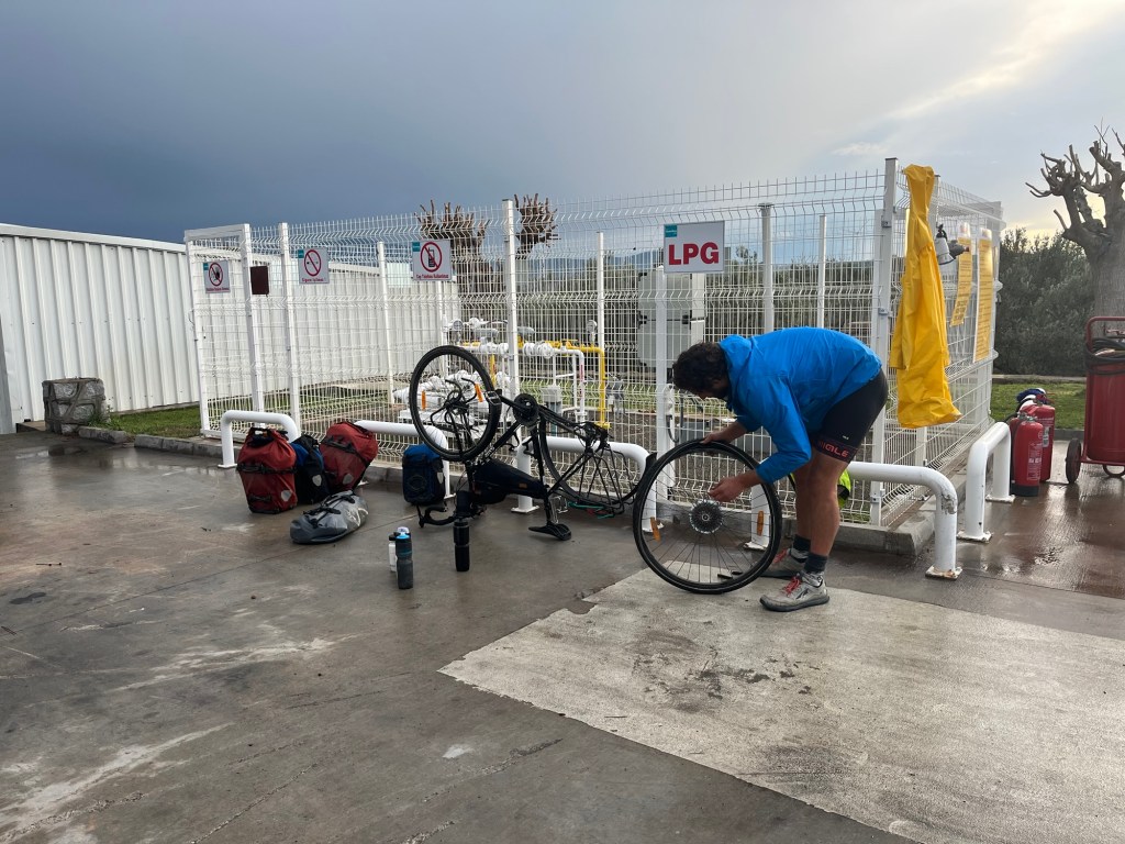 Bertrand had told us he’d had a puncture per day since Istanbul. We’d never spoken of our lack of punctures, 4000km and not a single one. Well now was the time. The rear wheel on the black Surly deflated quickly. A hundred metres up was a Shell garage, so we sped there as quick as we could.