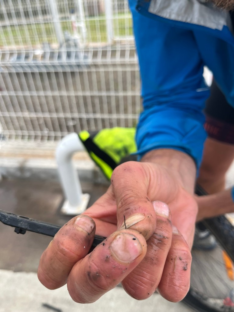 We pulled out, not one, but two sharp pieces of thin wire like metal. Glass isn’t the problem, these are. We just swapped over the inner tube. The hardest part was getting the tyre back on, it was a two person job. The Sun came out and we hurriedly cycled the last few kilometres.