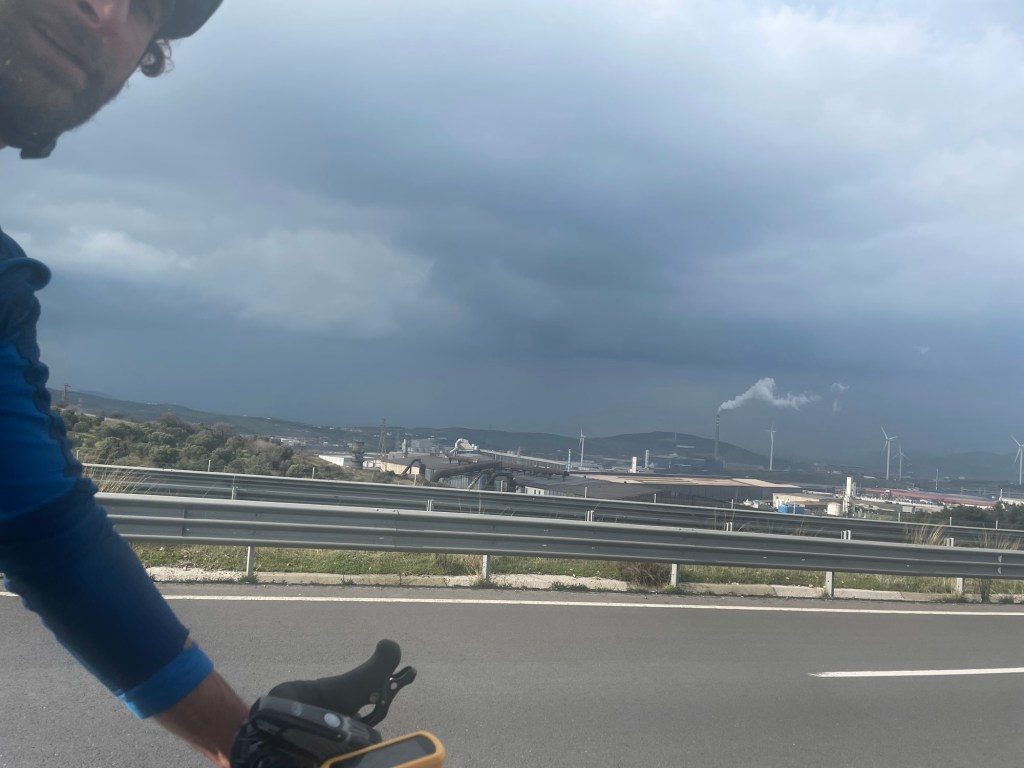 The reason the road the EV8 followed was so dangerous was because of the trucks. It went through an appallingly big industrial centre. We had looked down on it at first but now we seemed to be travelling through it. We weren’t sure how the road we were now on wasn’t dangerous. It was a hellscape. The air pollution was bad enough but then it began raining too. We had to mash as hard as possible. In some places there was no hard shoulder or worse it was covered in mud and stones.