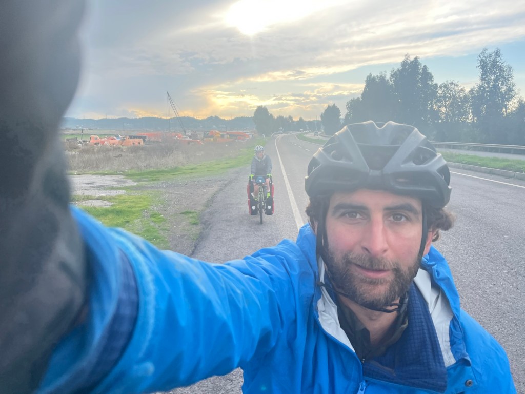The morning came and though we didn’t exactly hurry, we didn’t hang around. The wind hadn’t managed to dry the tent very well so we kept the outer separate in an empty bread bag. We pushed back to the road and set off on the slightly wet road. Fathi had nothing but incomplete holiday boxes. The road then gifted us a couple of climbs, they were hard to get into first thing in the morning. A couple of whooshing descents soon woke us up though.