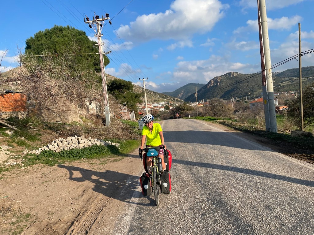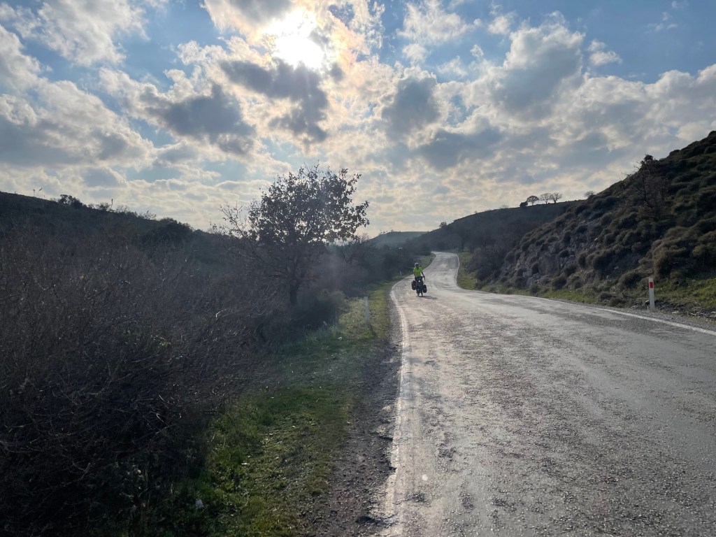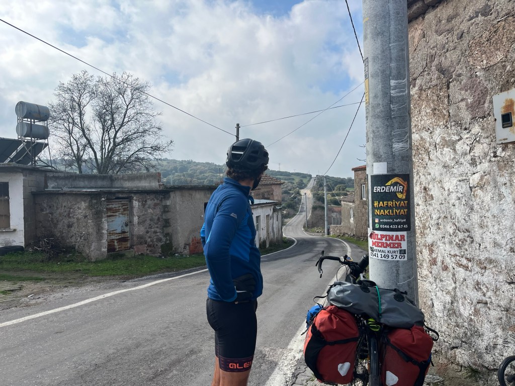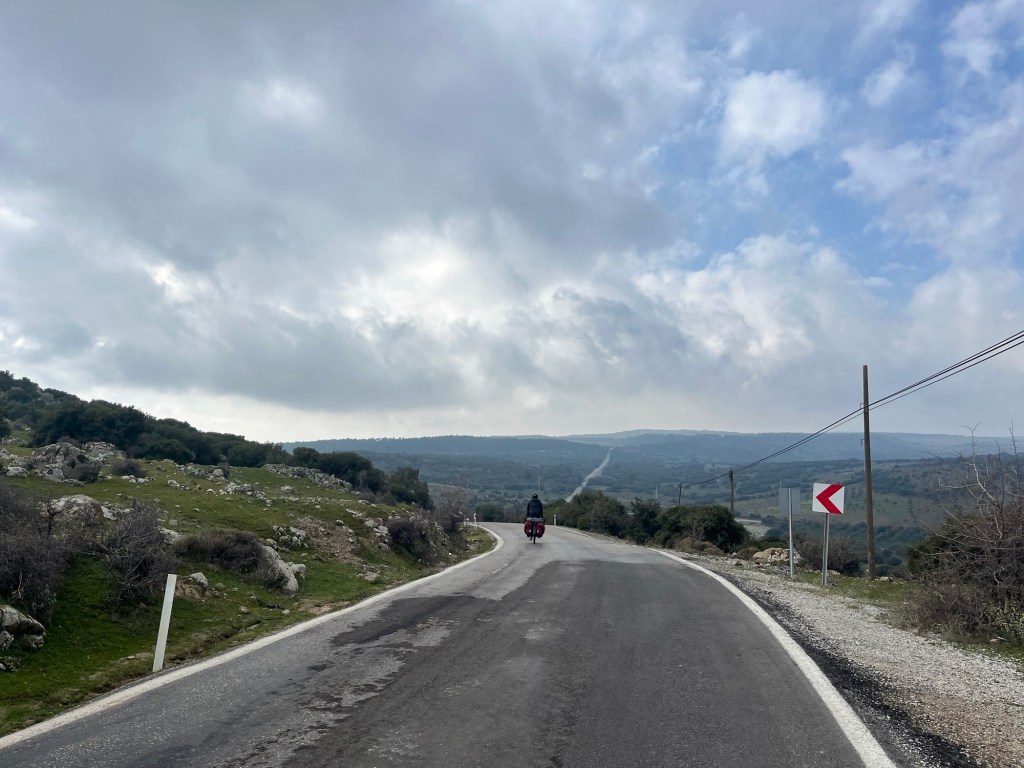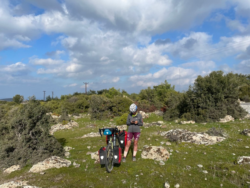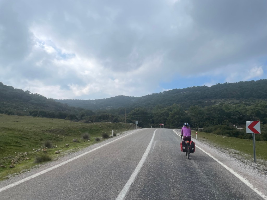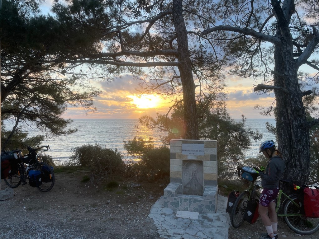 It was finally time to descend from the plateau we’d been riding on. A couple of hundred metres to drop and not too steeply. We were covering some kilometres now. As it was that unfortunate time of the month for Frankie we’d had no choice but to book another hotel further ahead along the coast. When we got to Gülpinar we went to the supermarket for some fruit and also some instant noodles. Picking food to eat had definitely become trickier.