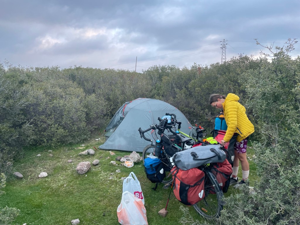 The pitch near the sea was nice, there were hot showers and even a kitchen. After we’d washed and pitched, we sat on a wooden bench eating those long desired noodles. They went down well. It had really warmed up and we sat outside the rest of the evening. The host came over to ask about the lights and we were very happy for her to turn them all off.