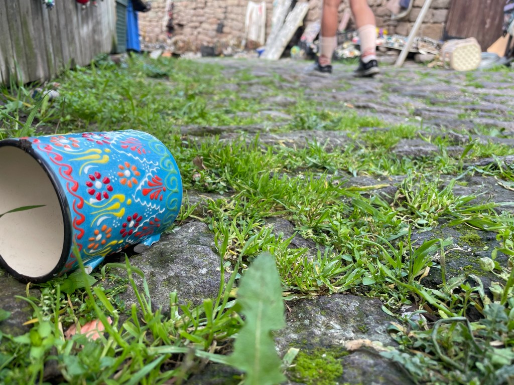 We took the side road towards the ruins and ended up walking up an even steeper cobbled road. Some men shouted to us from the nearby cafe. Nothing else looked open anyway. We ordered a couple of Turkish coffees, which came in the snazziest serving vessels yet. It didn’t redeem their price though. Somehow we got ripped off to the tune of 180 Lira, almost £5. This was a tourist hole for sure.