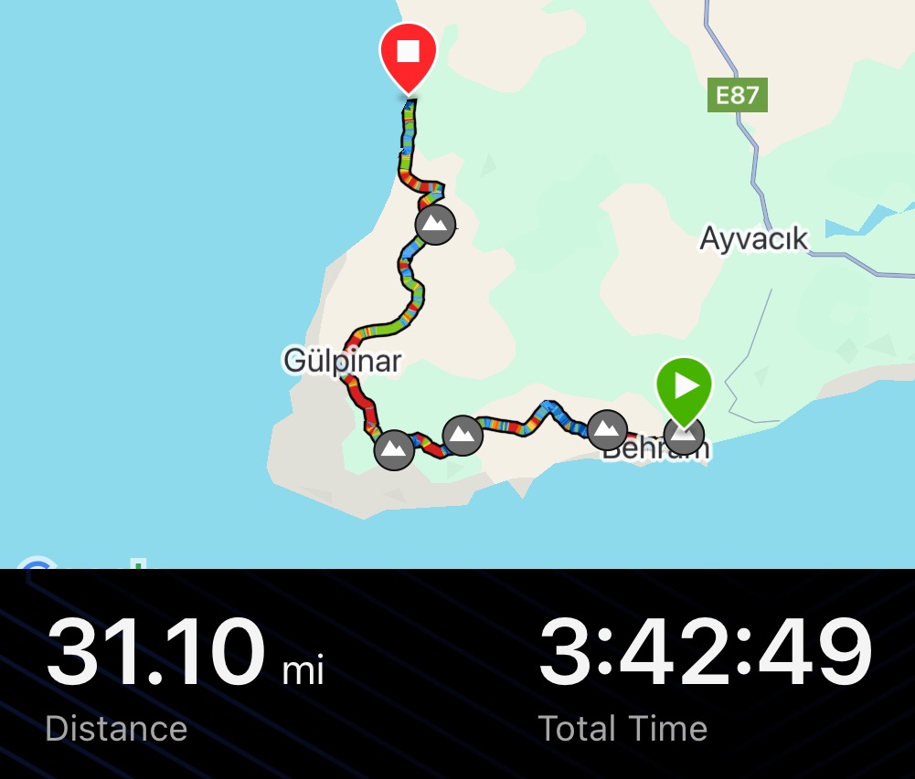 It was about 9am when we took on the hill to Behram. This was the new town set below the ruins of Assos. It was far steeper than the garmin had suggested. Probably not the overall gradient, but when it says 4% and we are going up sections of 14% we just feel a little misled.