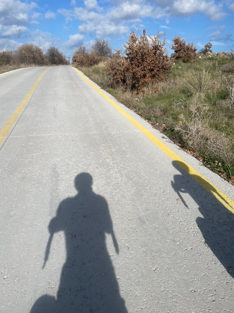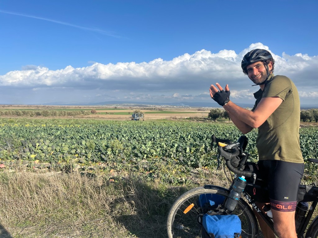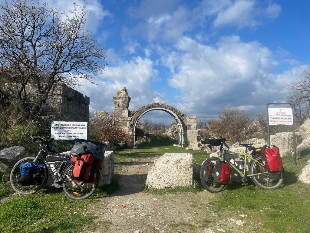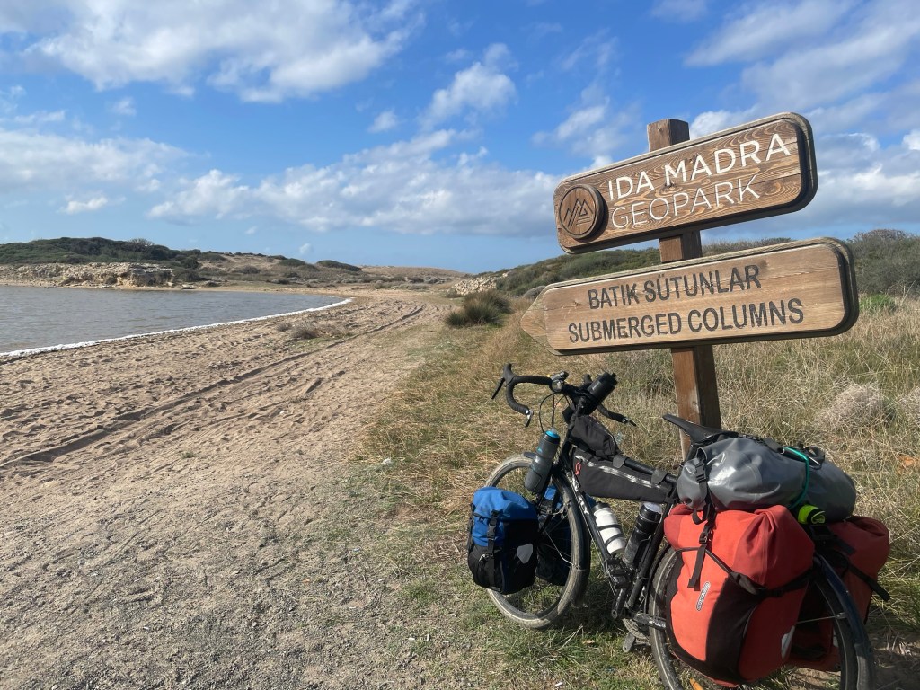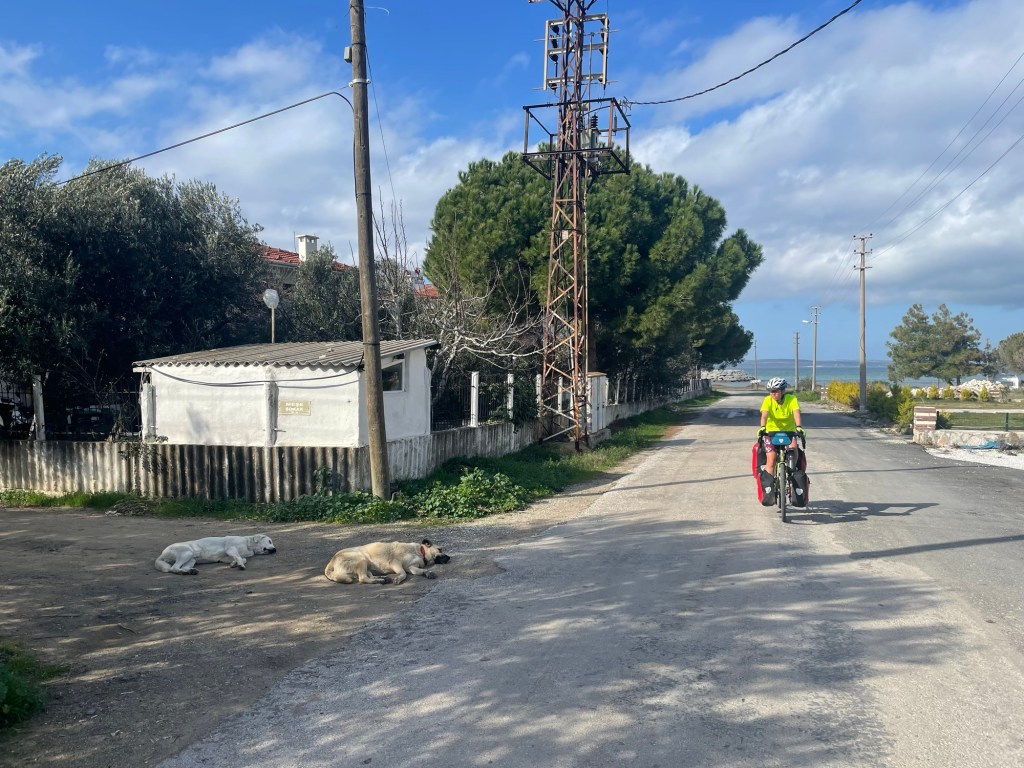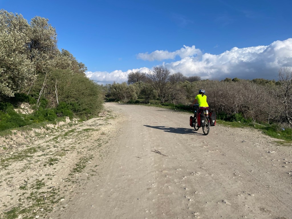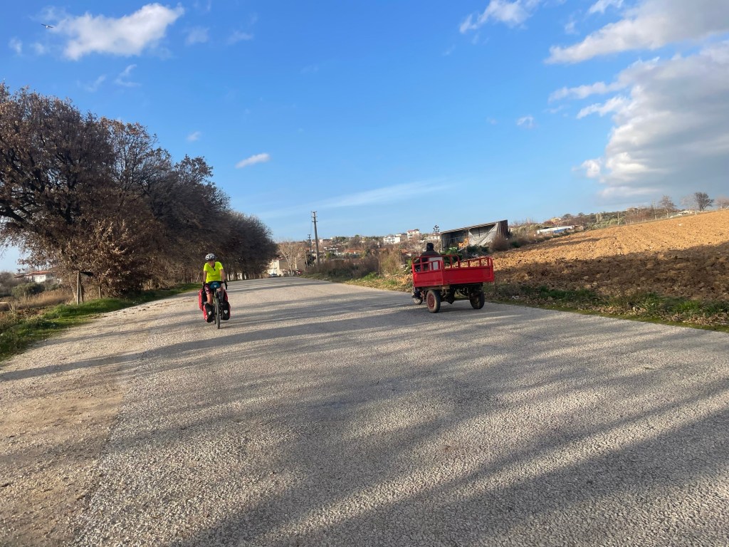 When we headed inland it was uphill through olive groves, it was pretty but we weren’t feeling it. We were keen to make some progress. The road was still that jarring rocky tarmac, but at the town of Geyikli it became tarmac again. Alas, the road into town was small paving stones.