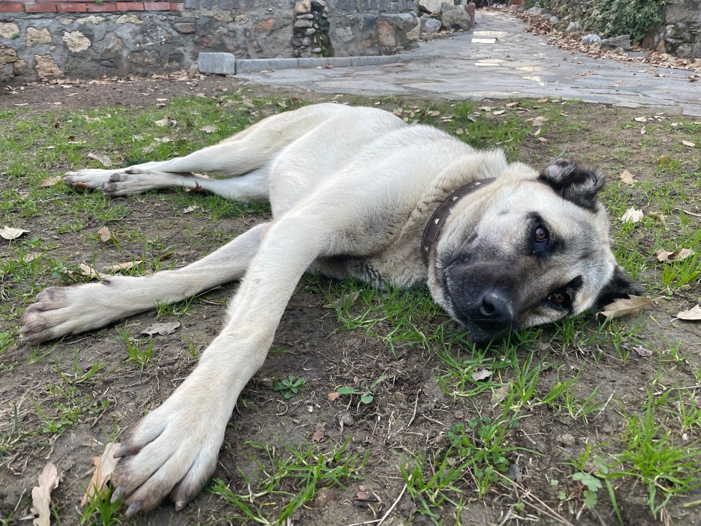 When we opened the tent in the morning, there was a rather large hound waiting outside. She liked to throw her weight around and make it difficult to get past her. But she was very friendly. We enjoyed her company by the sea, while we ate a slap up breakfast of baked beans, fried tomatoes and fried bread. Washed down with Turkish coffee. We hadn’t had the benefit of a kitchen for a while. So this was a real treat.