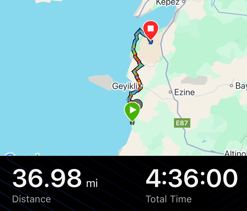 The road out of Geyikli was fast. It was slightly downhill for at least 5km, slick(er) tarmac and the wind was pushing us. It felt good to be flying after cycling through so much treacle. Once we got to Kumburun we had to start winding uphill again. Then at Üvecik we turned off onto an even more secondary road. It ran past the wind turbines that were moving fast, and then back out to the coast at Yeniköy.