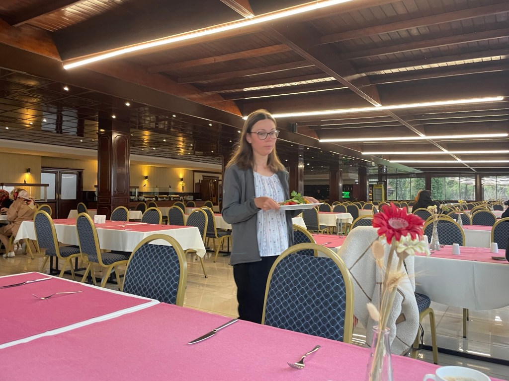 The room was toasty. We propped the balcony door open overnight, but we had to shut the toilet door because it smelt like drain and spread into the room. We went to enjoy our included breakfast at around 9am. This time it was a buffet. We could eat fried potatoes, salad, bread, assorted ‘jams’, and cereal. There were quite a few people staying. Most of whom appeared to be Turkish. Most of the women were wearing a hijab.