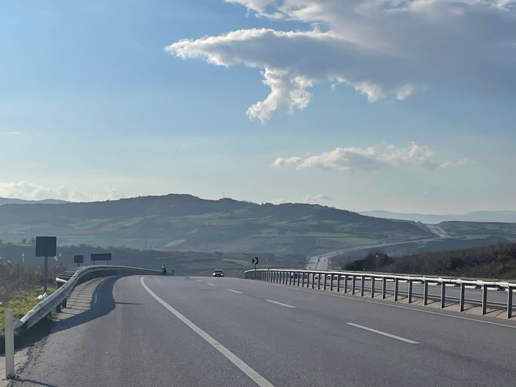 As we were leaving Çardak, and rejoining the highway, we remembered this was the last place to get some food. We saw a bakery over the road and got some ekmek but decided to make do with what else we had. We’d been on the flat for a while but now we had hills again. The landscape was made up of big green rolling hills, which made for nice views when contrasted with the open water to our left.