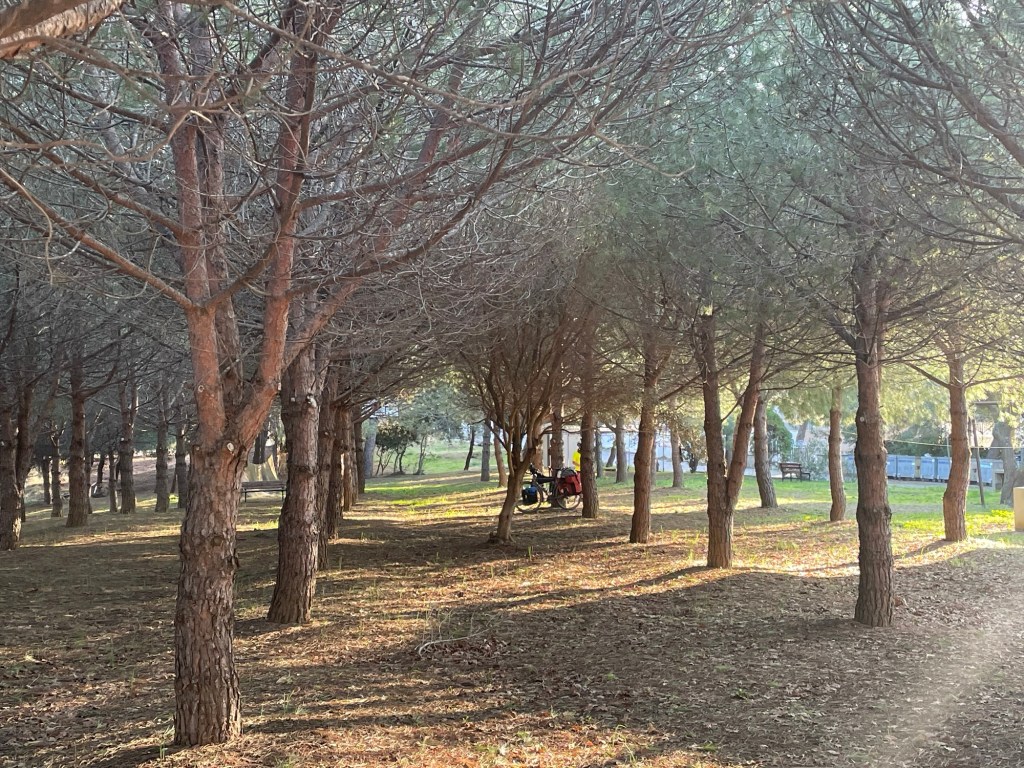 We ended up going another 20km before we started looking for a place to stop. There weren’t any hotels round here, we’d have to be camping. We originally planned to head to Gürece, as it had some beach, but as we passed a community called Bozkent we saw a nice man made woodland.