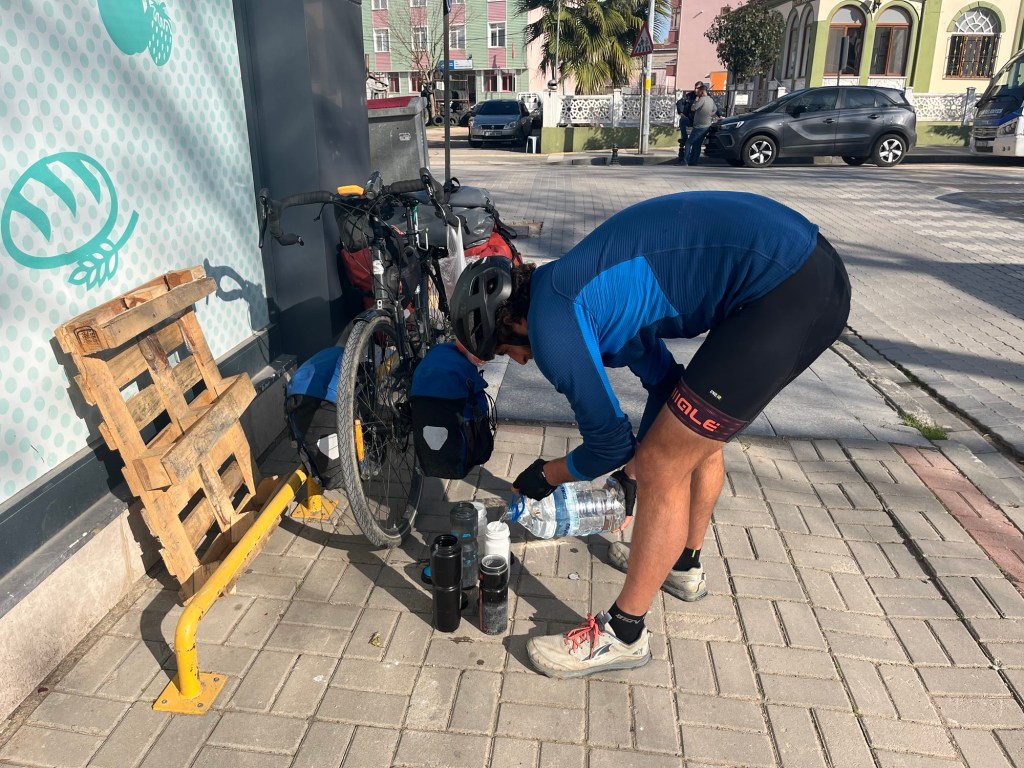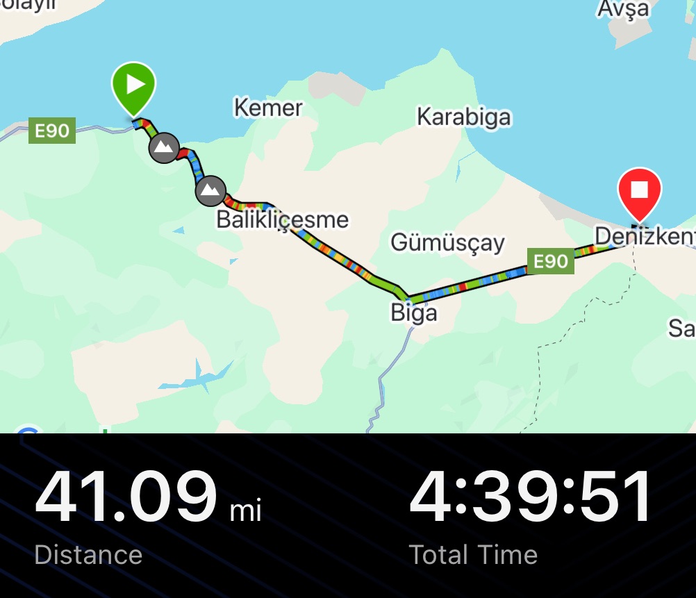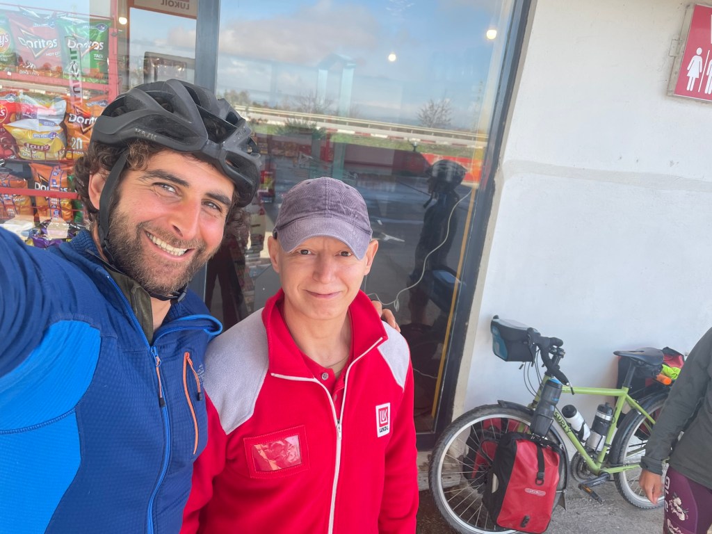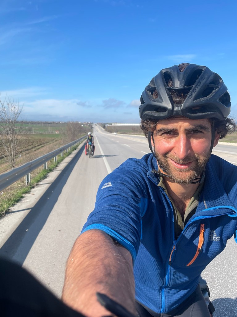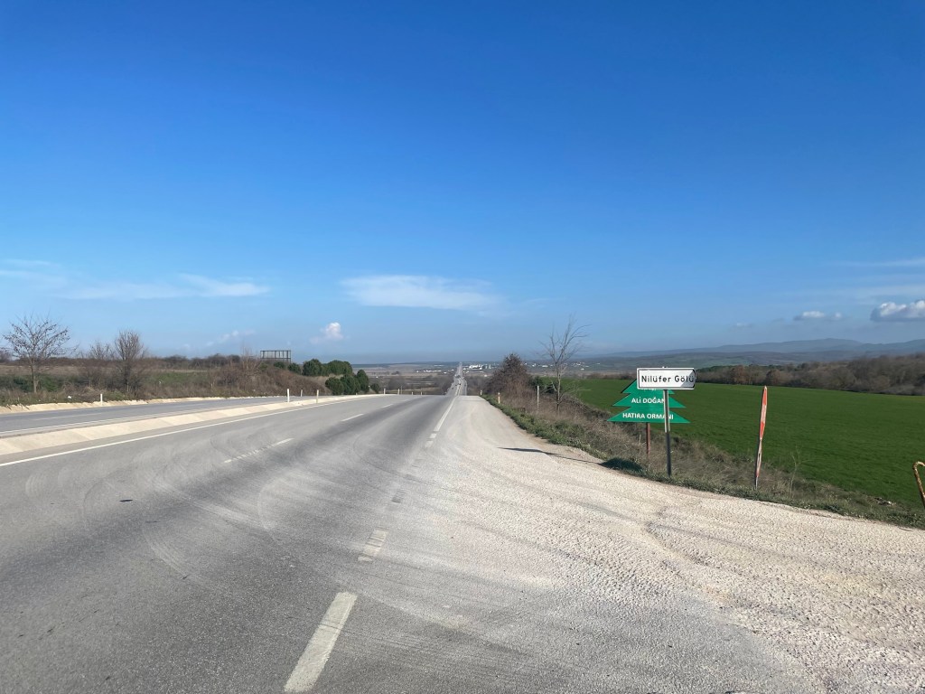 After we left it was still joyous sunshine on the highway. The next stop was in Biga. It was all fairly flat and nothing happened. Just miles of occasionally stony, occasionally muddy, hard shoulder. People would often go past tooting playfully on their horns and waving at us.