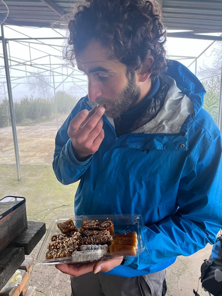 He gestured for us to sit down in the Sun and he joined us to chat. The usual conversation ensued about our journey and what we did for our jobs. Frankie always found the domination of men a bit odd as she was the odd one out. But they didn’t treat her any differently. He was keen to bring us food and we tried to convey our dietary preferences as best we could. He came back with some scones. They probably had butter in them.