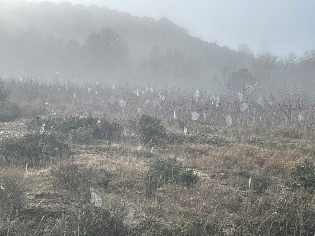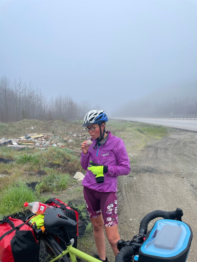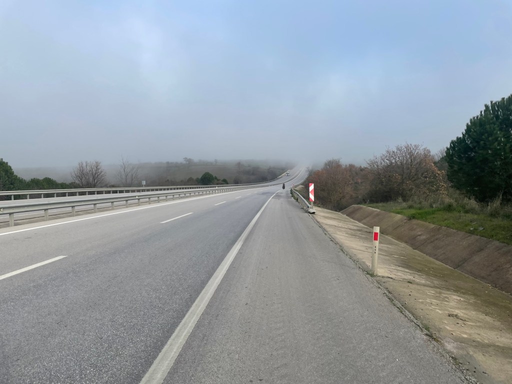 When we did go out we found a foggy world. The clear skies had been replaced by cloud. It was straight back to the highway, and visibility was poor. Perhaps 100m, maybe a little more. We felt a little nervous so we put our brightest clothes on and kept well inside the boundary and f our hard shoulder. The hills were tough after the push we’d made the day before. We took a break after about 10km to polish off the dried fruit we had and finish the, now flat, coke.