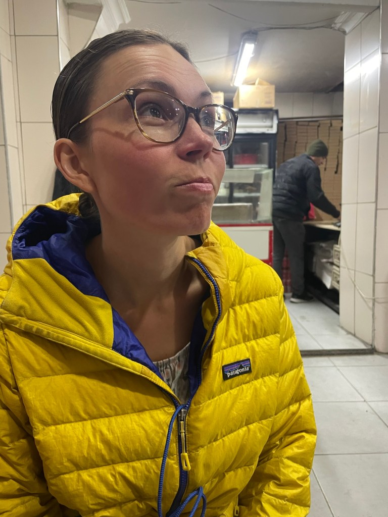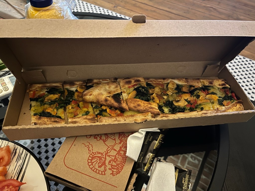 We lugged up the bikes. Nothing was too hard to get up now. The flat was spacious and modern. Really comfortable. We hoped the one downstairs would be the same. After a nice hot shower we went to get dinner. We asked at a local pide shop if they’d make a vegan one for us and the young man, who seemed to have lost his voice, was happy to help. Frankie nipped off to buy some fresh salad.