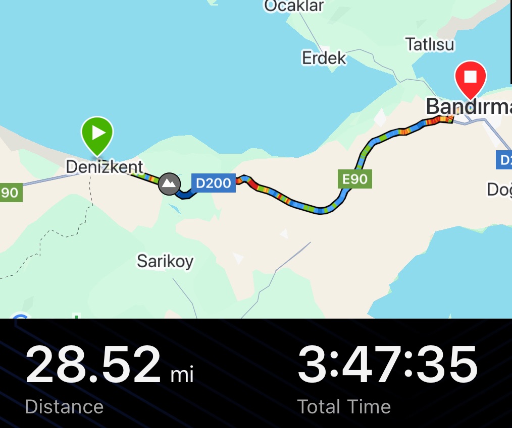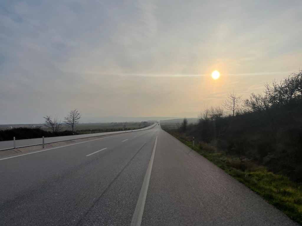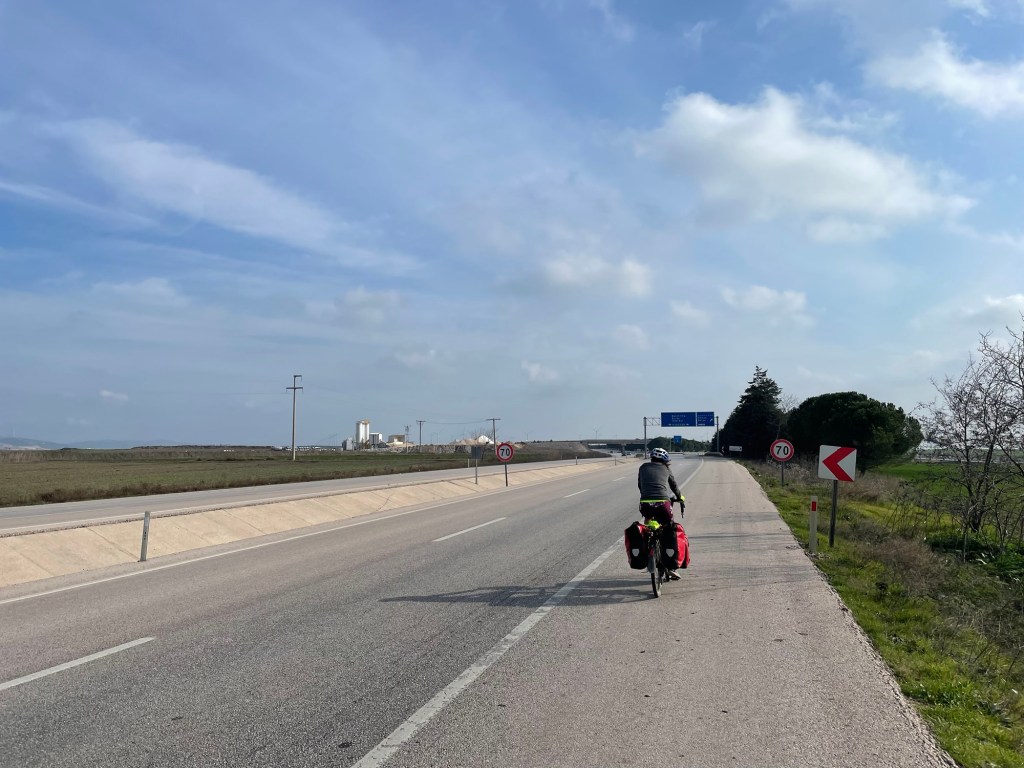 There were some nice views down to the sea, but it was mostly mundane farmland. Not an exciting route. The whole route from Çanakkale had been a little disappointing. More of a last slog than a highlight. There weren’t any ruins, there hadn’t been any minor roads to amble on. We’d been surrounded by trucks for 3 days. With friendly drivers who gave us room and waved. But still noisy trucks. It was hard to know what to make of it, but it still felt like an achievement to endure it.