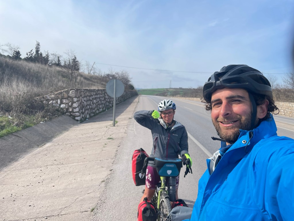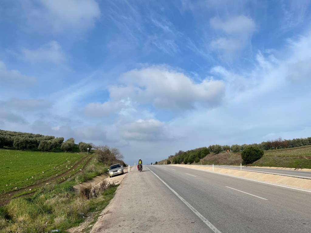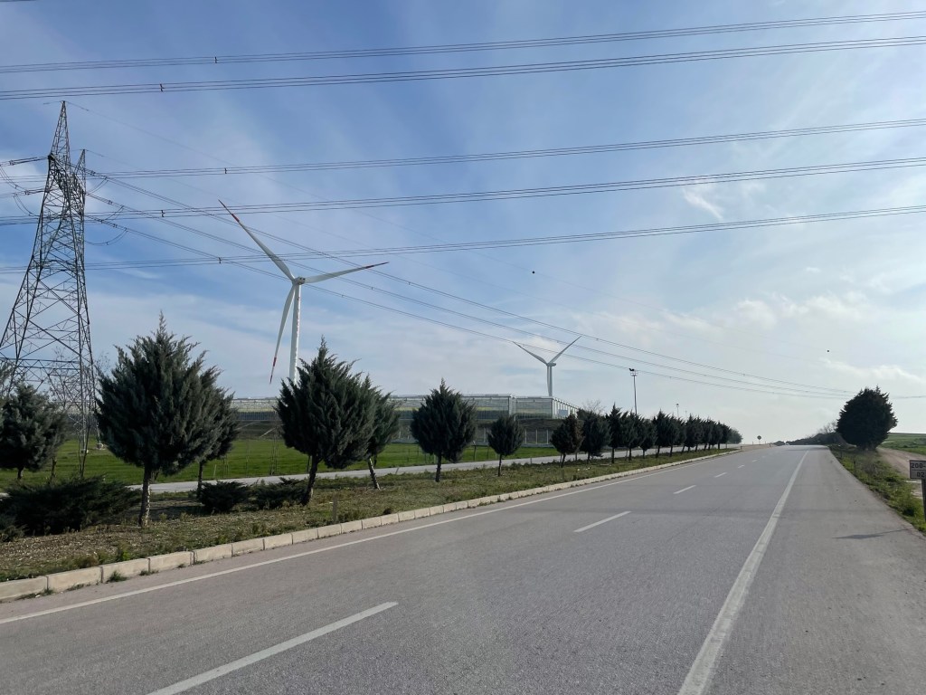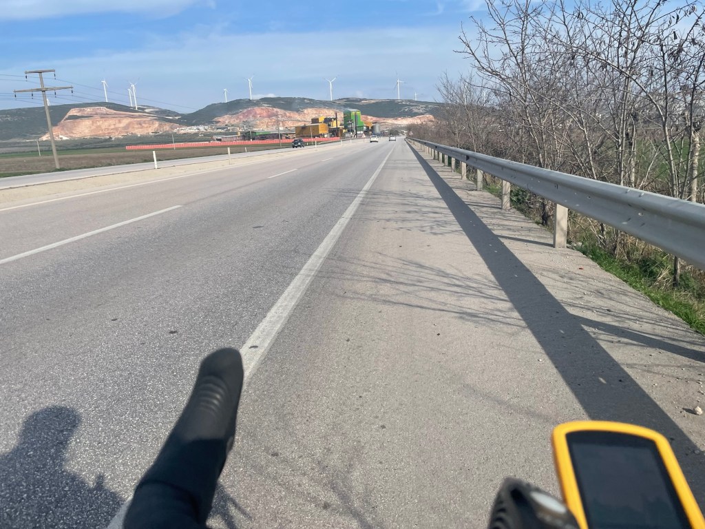 As we approached the end of the plateau there was one more mini climb. It felt like the hardest hill we’d ever climbed. The wind was relentless. With the additional force blowing us back it was as though it was 15%, and we were cycling through treacle. The wind buffeted us enough, but when a truck passed it introduced completely new wind directions. We were so close to dropping into Bandirma we could taste it. But we could equally hoss our bikes in front of the next lorry and dust our hands off.