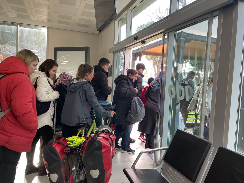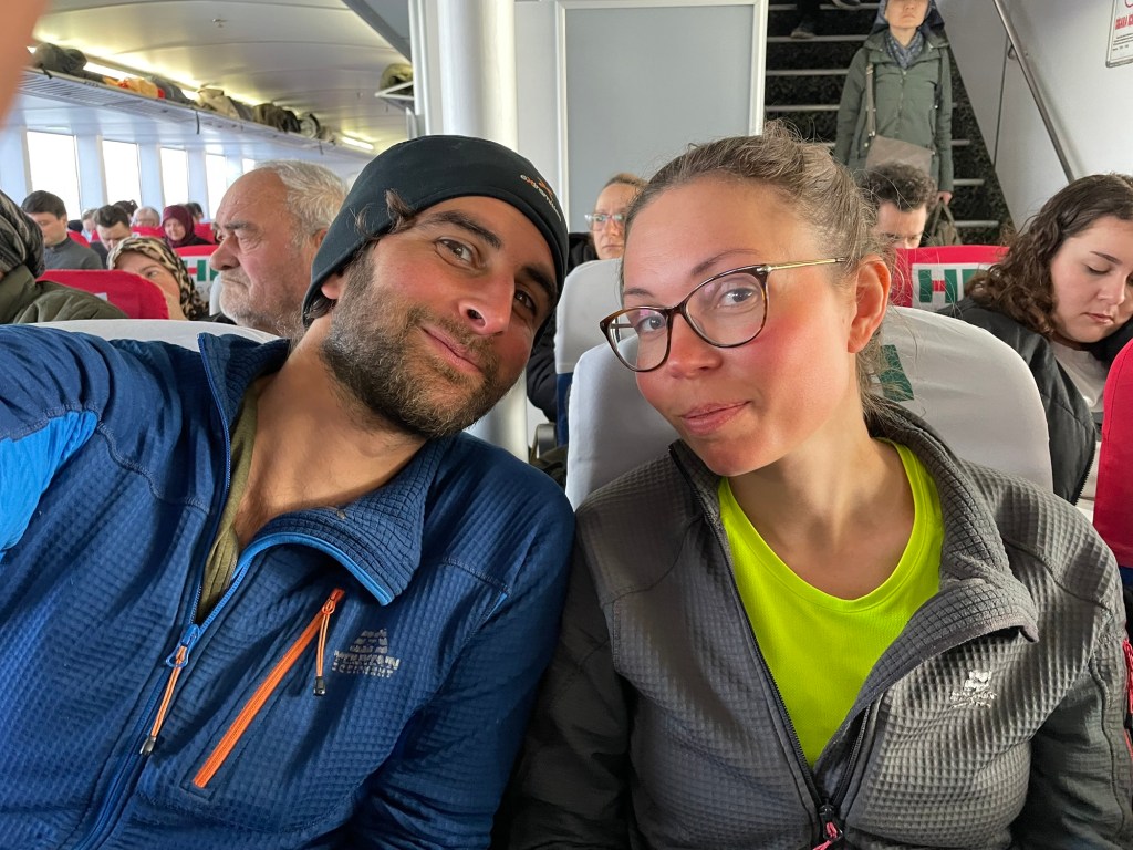 The descent was mediocre, but at least it meant we didn’t need to use our brakes. The wind was enough. We followed the signs for the ‘feribot’. Dropping 150m in about 3km. Avoiding the uphill at any cost, we took a one way street along the docks to arrive at the port office. Eagerly we darted in, wheeled our bikes through beeping metal detectors, and approached the ticket desk.