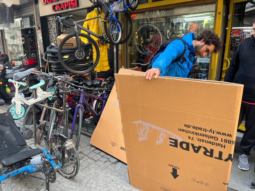 Obtaining cardboard boxes is on the surface an easy task. However, Istanbul has a notoriously high demand for them. A lot of people cycle to Istanbul as an end destination. They also have ‘pickers’, these guys have huge trollies and roam the streets collecting all the cardboard from the bins. They can sell it. So cardboard isn’t free here. You have to buy the boxes and the shops all know the deal.